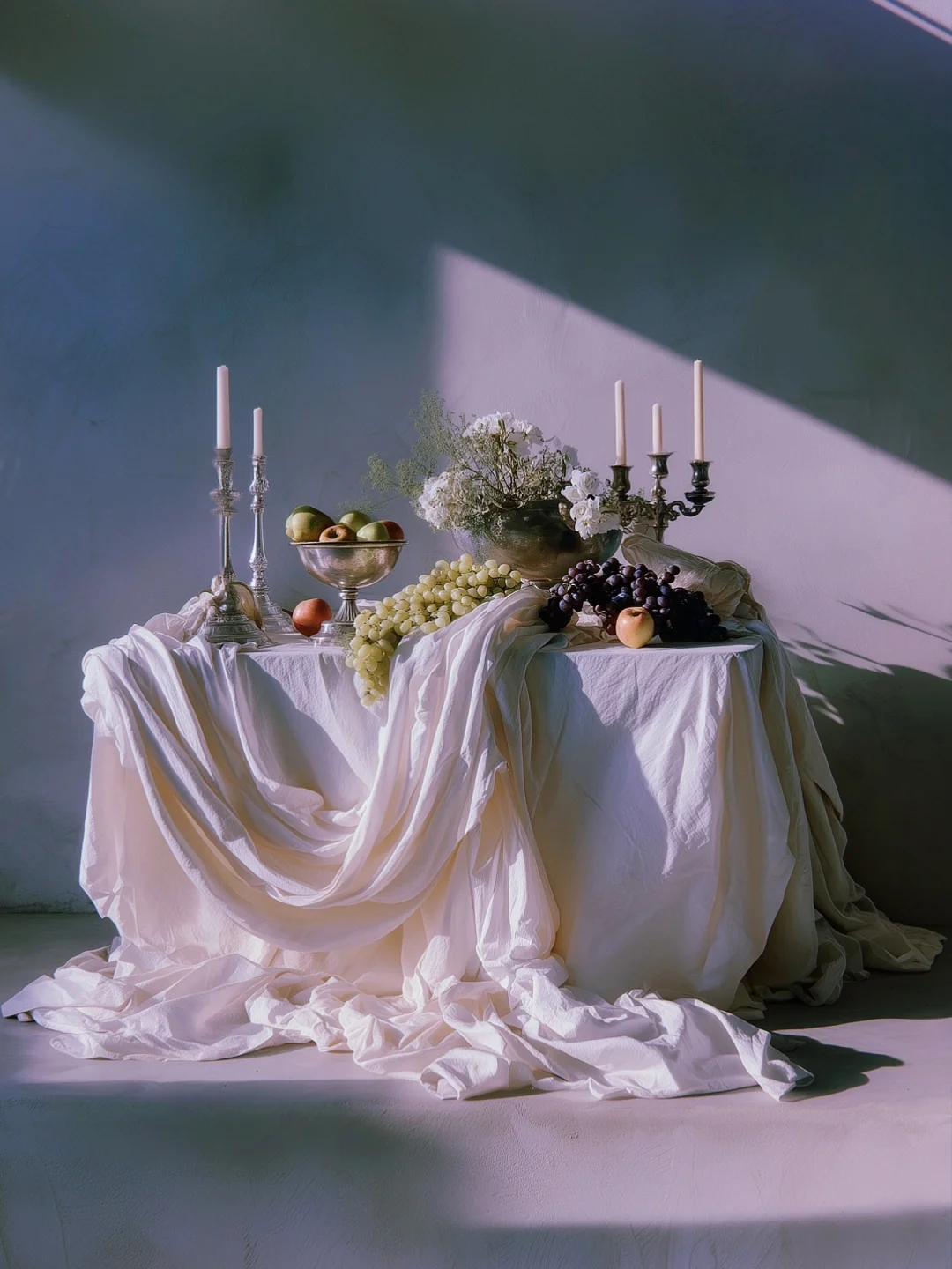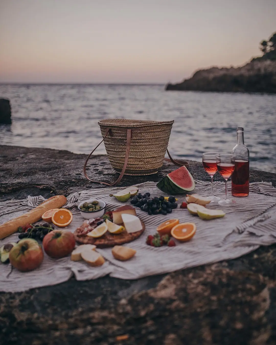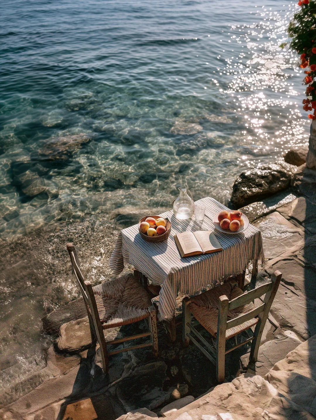 框架式构图,橄榄枝叶形成天然顶部框架,将视线引向中景野餐区域。前景亚麻布、中景果实与玻璃杯、远景海水形成三层递进,强化纵深感;主体置于画面下半区,符合视觉舒适区,慵懒松弛感拉满。