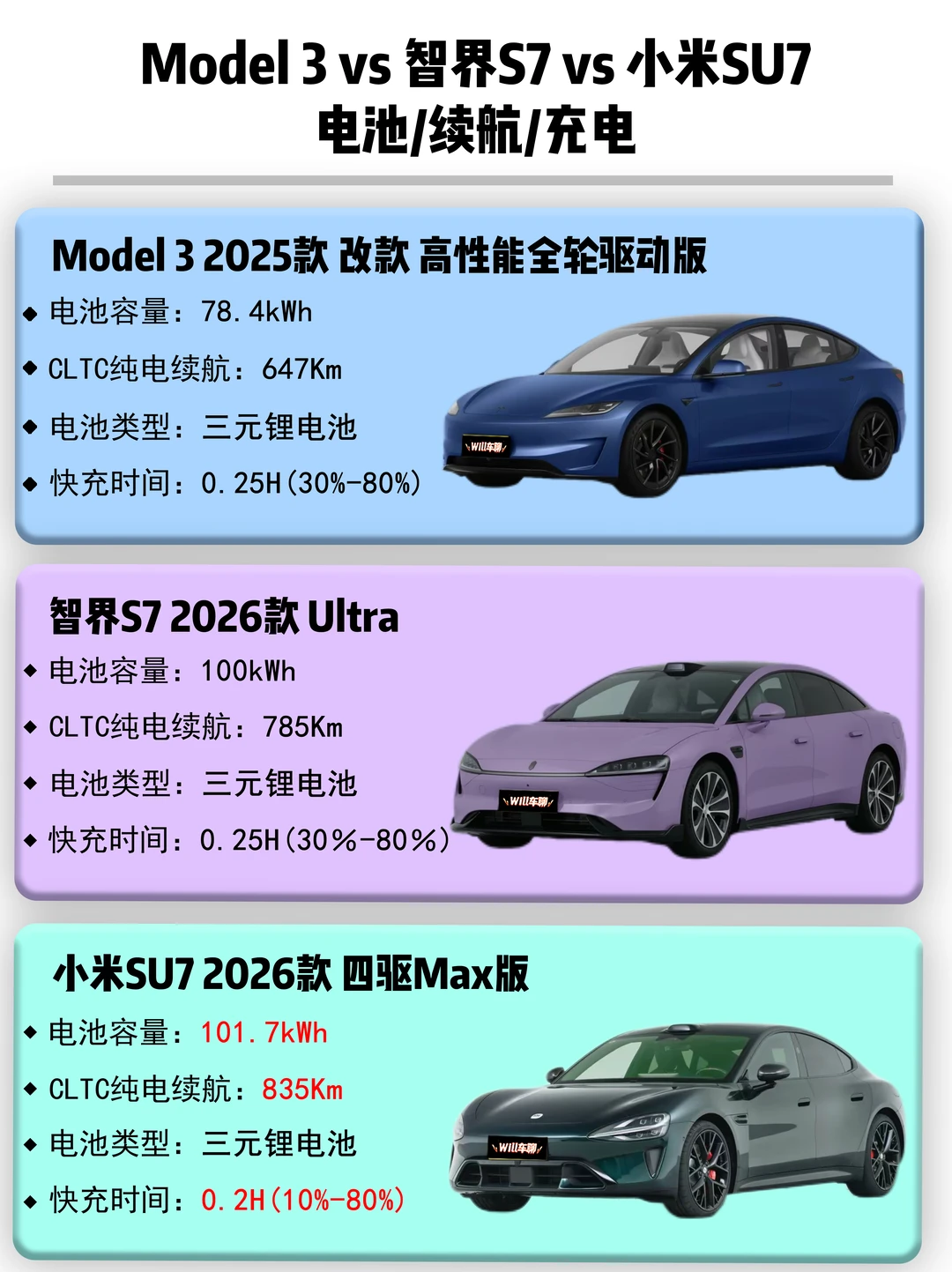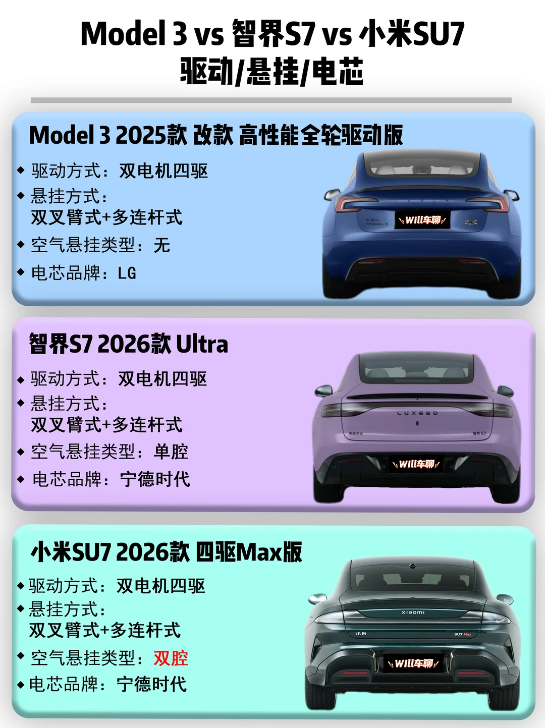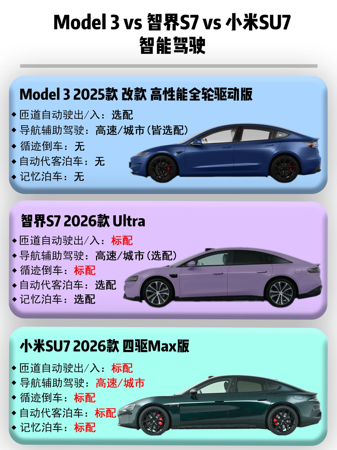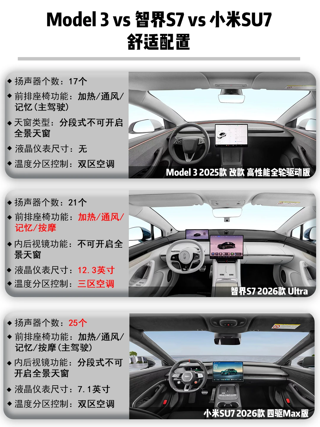 别急,今天直接拉来Model 3 2025款 改款 高性能全轮驱动版、智界S7 2026款Ultra和小米SU7 2026款 四驱Max版,看看到底谁更懂你。