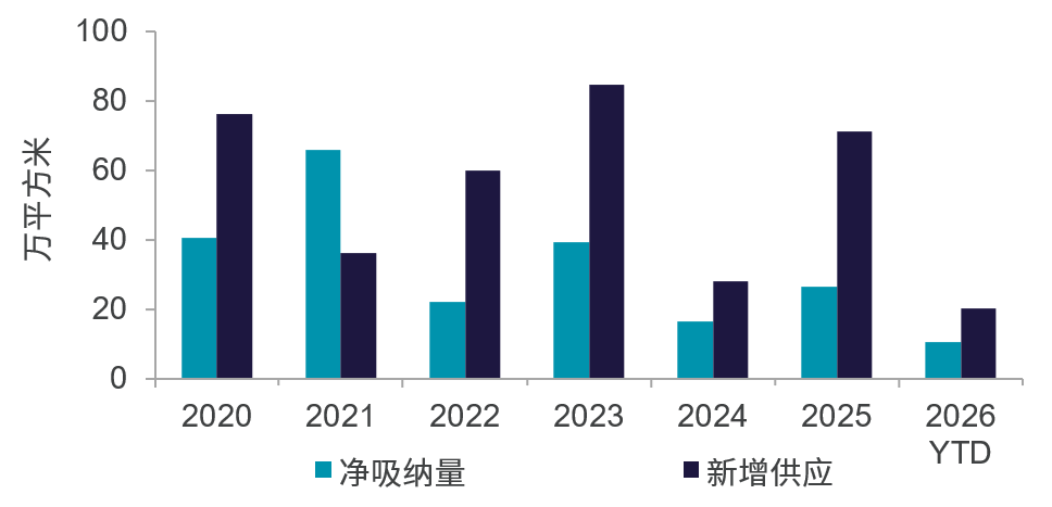 2026年一季度,深圳甲级写字楼市场录得约20.1万平方米的新增供应,推动全市存量攀升至928.3万平方米。受新增供应及部分次新项目去化提速带动,全市净吸纳量达到10.4万平方米,为近五年同期最优水平。