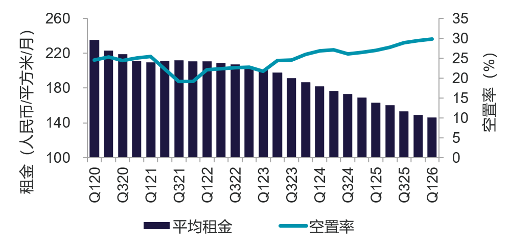 不过,良好的吸纳表现仍以租金下调为代价:截至一季度末,全市甲级写字楼平均租金为每月每平方米146.4元,环比下降2.0%,同比下降10.2%。在新增供应影响下,全市空置率升至29.8%。部分散售楼宇的小业主租赁策略更为灵活,有效加快了楼宇去化节奏。相较于单一业权楼宇,该类楼宇租户结构更趋多元,服装店、牙科诊所、医美机构、健康管理、自习室等经营性业态占比更高。此外,可显著降低租户前期投入成本的带装修交付模式渐成趋势,部分办公空间凭借装修及配套完善、空间利用率高、租约灵活等优势,在市场中脱颖而出。