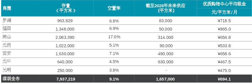 同期的福田商圈总客流量达845万人次、销售额约7.7亿元,同比均实现正增长;宝安更实现大幅跃升:重点商圈总客流量超550万人次,同比增长32.7%;总销售额超6亿元,同比增长16.4%。在客流规模和消费动能的双支撑下,全市优质购物中心整体空置率稳居9.1%,与上年末持平。