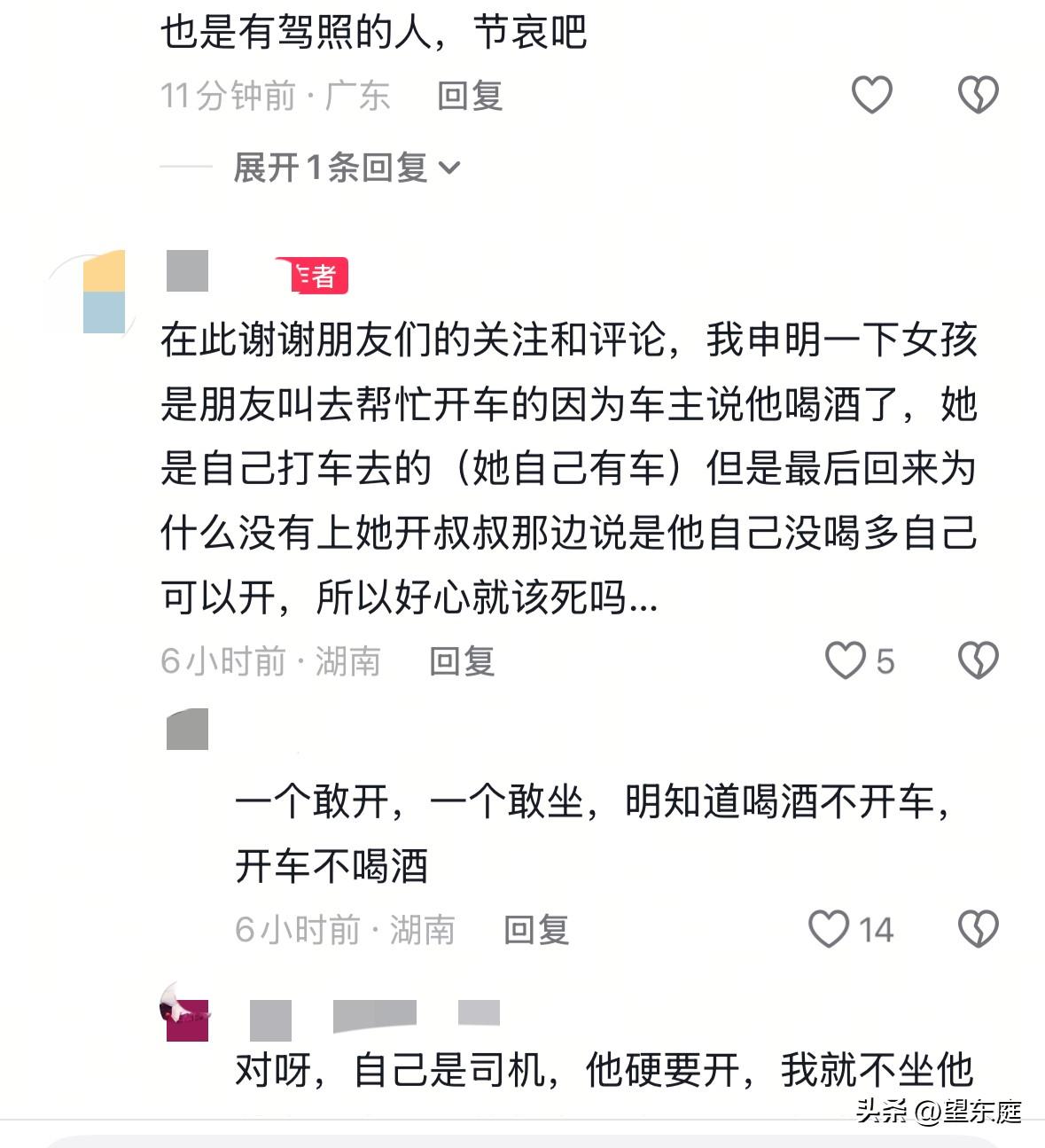 刷到了湖南邵东的一起悲剧,整个人都不好了!如此漂亮的一个年轻女孩,被朋友叫去代驾,结果,车子掉进了池塘里,一车人全部殒命! 事情发生在2026年1月17日。 根据女孩家属的发声,事情的来龙去脉大概是这么一回事: 当晚,女孩接到了朋友的电话,对方请她帮忙去做代驾把车子开回家。于是,女孩就打车到了指定的地点。 可没想到,回程的时候车主却没有让她驾车,对方坚持说自己没有喝多,是完全能把车子开回家的。 作为一个驾驶员,最该坚持的原则就是:喝酒不开车,开车不喝酒!可偏偏有些司机意识不到问题的严重性。 此番,女孩是特意过来代驾的,按道理来说,遇到这种情况她应果断拒绝对方。可女孩因拗不过他,也就默许了。为了省下回去的路费,她就没有再打车回家,而是坐了对方的车子一起回。 哪曾想,车子在半路上就冲进了池塘里面! 偏偏那时候夜已深,周边的村民们早已经进入梦乡,以至于没有一个人及时发现有车子落水。等到第二天一早,才有村民发现情况,可彼时,车上的几个人早已经没有生命体征了。 时隔两个多月,2026年3月31日,女孩家属在社交网站上发文讲述了事情的来龙去脉!他们怎么都想不通,自己的孩子只是好心去帮忙而已,怎么就把命丢了呢? 站在他们的角度考虑,原本好好的女儿说没就没了,想要一点赔偿也是无可厚非!可由于这是一起单边事故,加上车主也在事故中丧生,这就意味着车上的乘客是很难得到赔偿的! 车祸猛如虎,这样的代价太过沉重了,可有些人直到走到生命的尽头,才会懂得去敬畏生命,就比如那位已经喝醉酒却仍要坚持开车的司机。在车子落水那一刻,想必他已是后悔不已,可人生从来没有回头路! 经此悲剧,可以看出很重要的一点: 那就是无论何时何地都要有自己的原则。女孩从头到尾都是清醒的,她万万不该让一个已经喝醉的人坐上驾驶室,更不应该在对方拒绝自己代驾后,仍坐上他的车子回家![祈祷][祈祷][祈祷][祈祷]