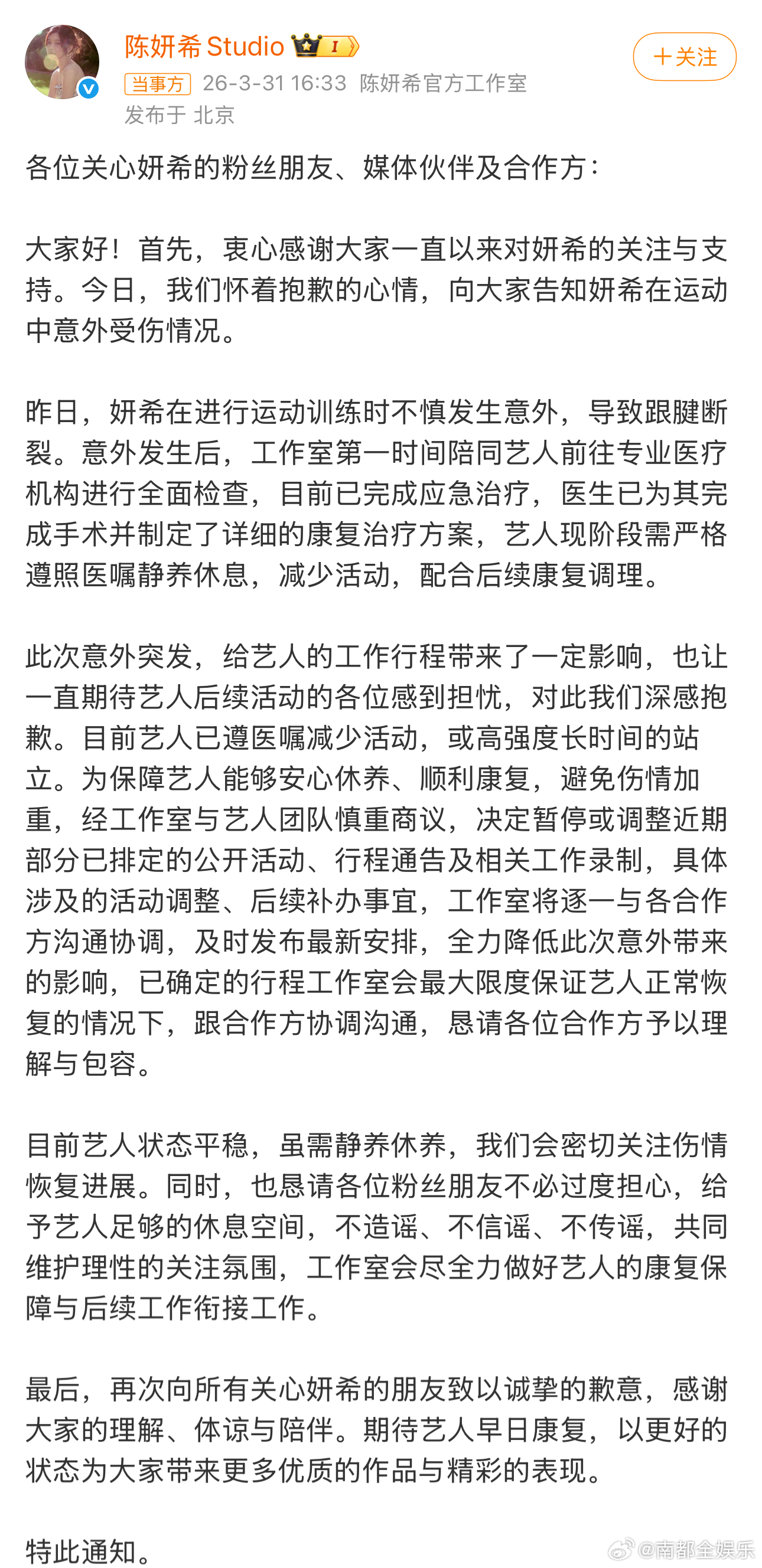 陈妍希跟腱断裂陈妍希报平安31日,工作室发文称进行运动训练时不慎发生意外,导致跟腱断裂,近期将减少活动安心养伤。随后,陈妍希也发文报平安:“很抱歉我又受伤了,但请别太担心,我会好好养伤的,也是时候练新英雄了✌🏻!”
