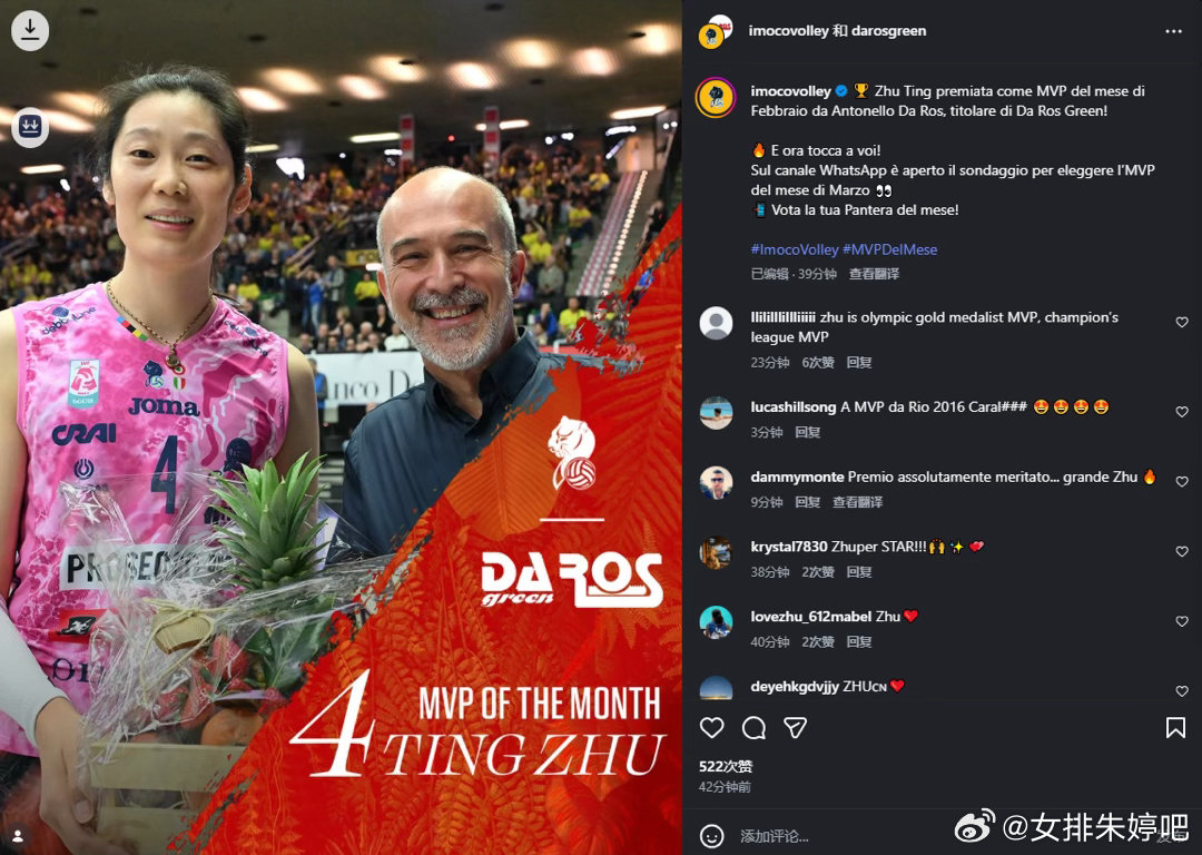 朱婷掌上明朱 一路婷你 获得2月MVP朱婷留洋第七季