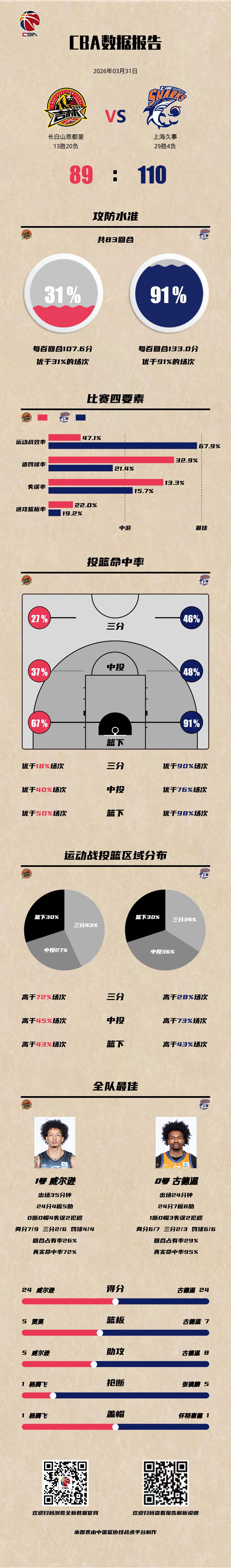 长白山恩都里 89-110 上海久事吉林男篮vs上海男篮 长白山恩都里:威尔逊24分4篮板5助攻,摩尔17分4篮板3助攻,栾利程13分3篮板3助攻; 上海久事:古德温24分7篮板8助攻,弗格19分3篮板,王哲林13分5篮板。以城之名