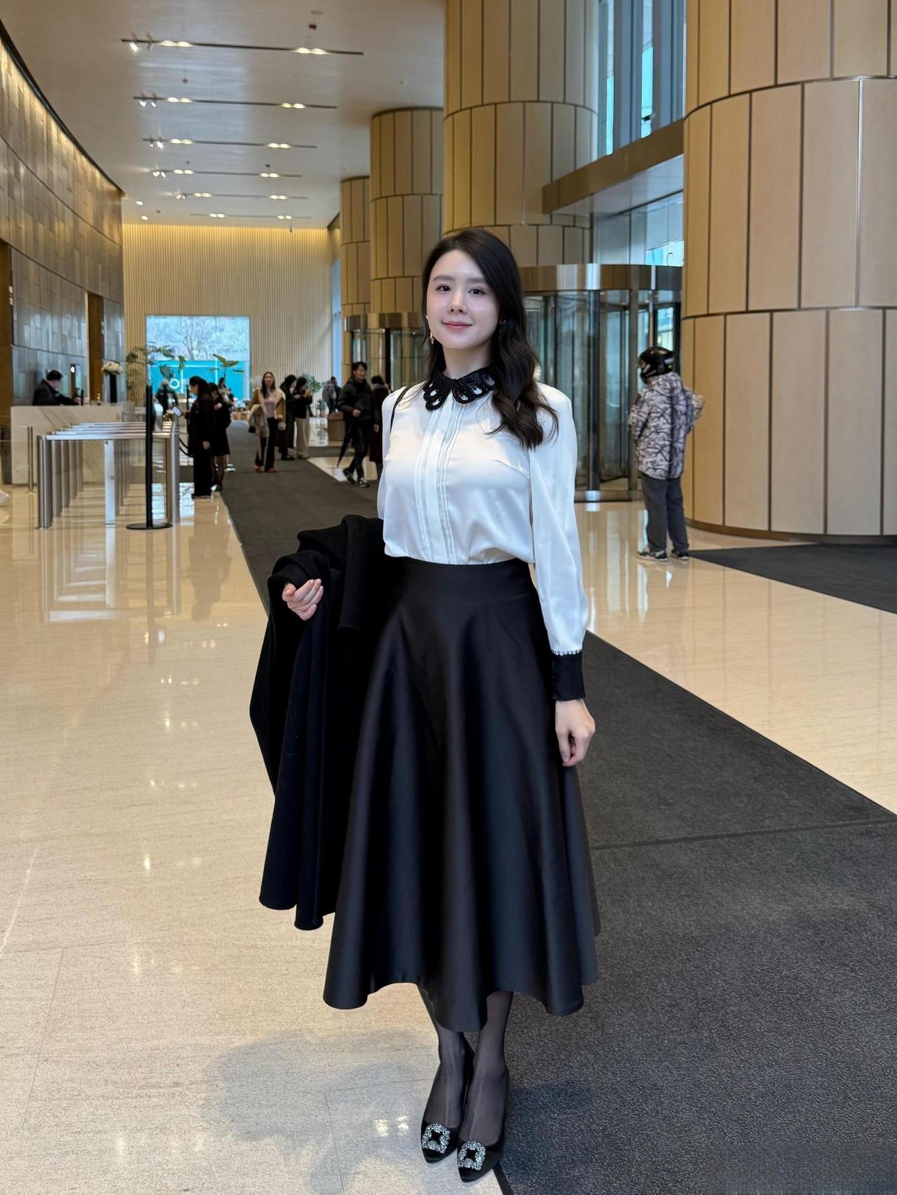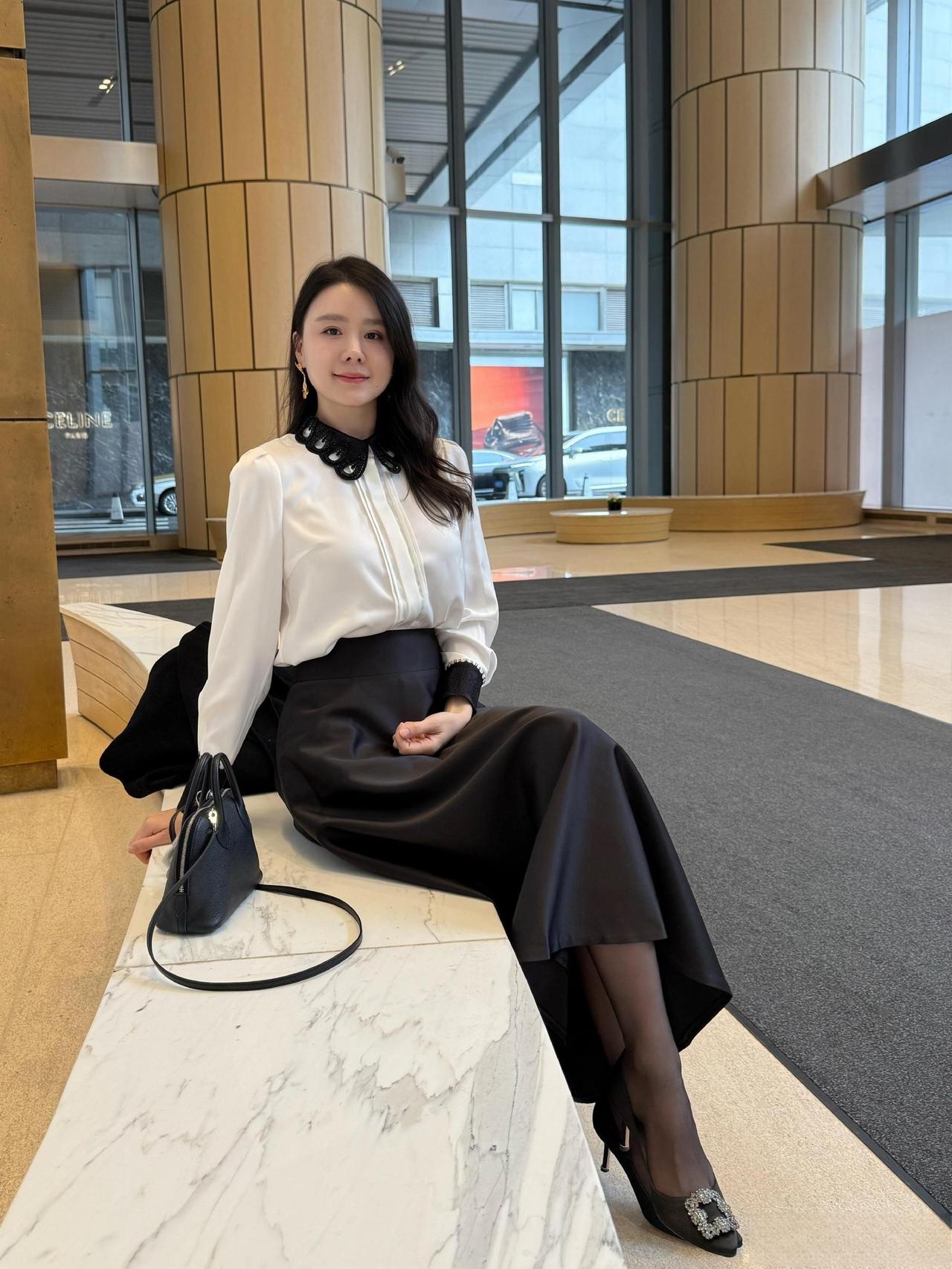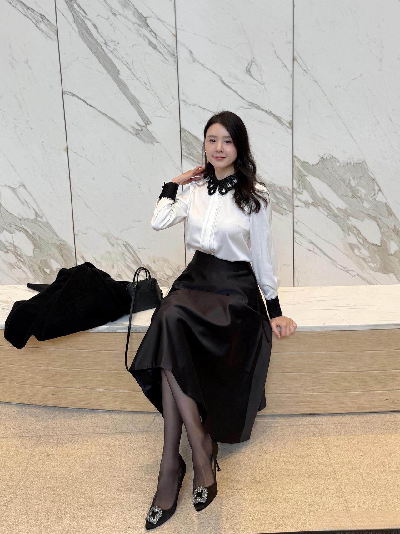 这套是优雅贵气黑白风,核心是黑色大衣+白衬衫+缎面半裙的搭配:宽松大衣自带松弛贵气,缎面裙增加优雅质感,领部蝴蝶结+闪钻单鞋强化精致细节,气质又有格调。职场通勤怎么穿才高级? 黑裙如何穿出高级感? 黑裙白衬衫穿搭
