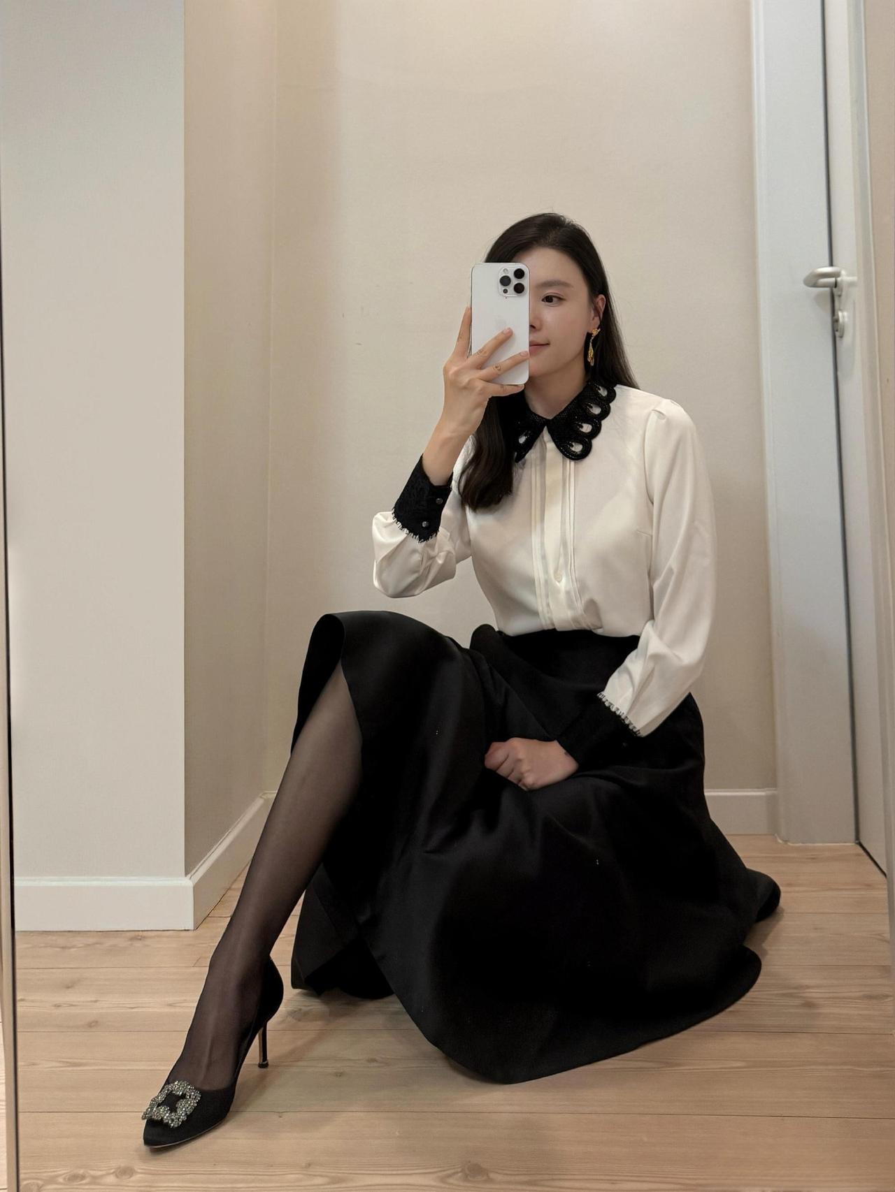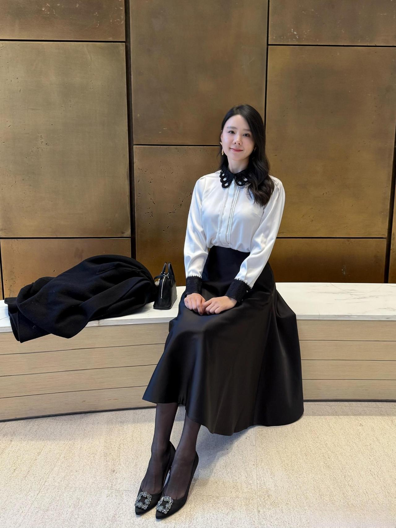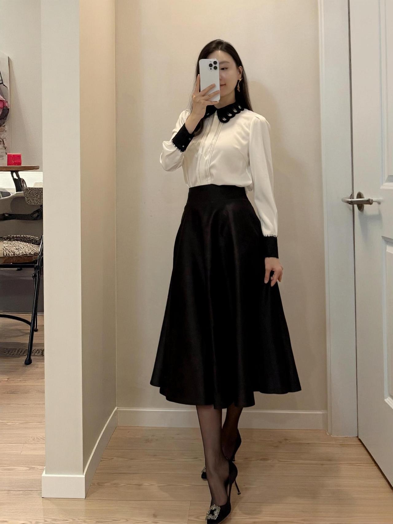这套是优雅贵气黑白风,核心是黑色大衣+白衬衫+缎面半裙的搭配:宽松大衣自带松弛贵气,缎面裙增加优雅质感,领部蝴蝶结+闪钻单鞋强化精致细节,气质又有格调。职场通勤怎么穿才高级? 黑裙如何穿出高级感? 黑裙白衬衫穿搭