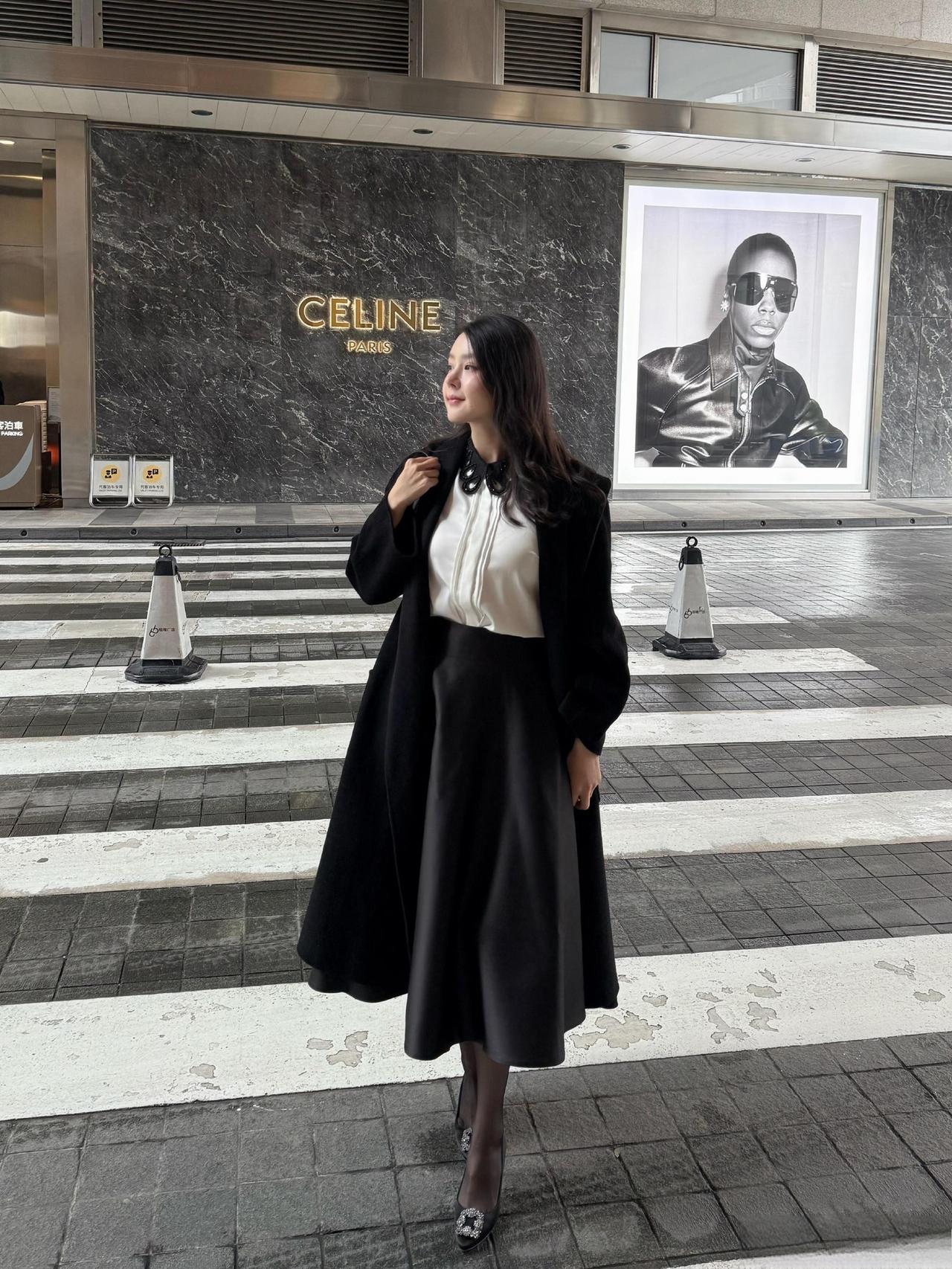 这套是优雅贵气黑白风,核心是黑色大衣+白衬衫+缎面半裙的搭配:宽松大衣自带松弛贵