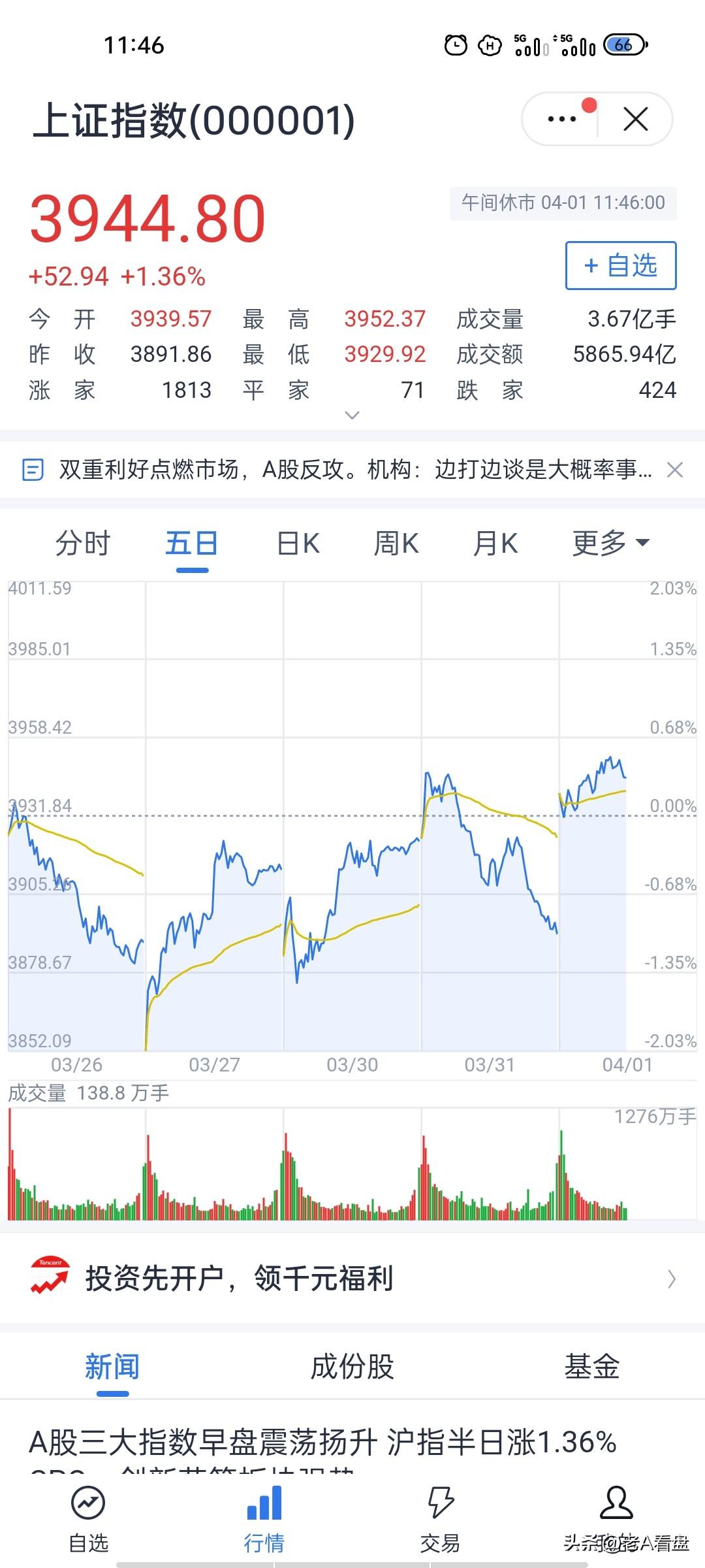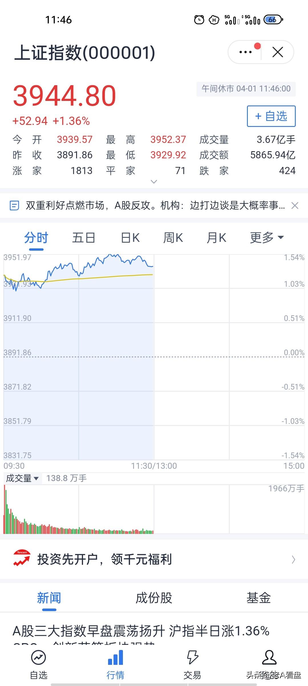 放量反攻,早盘收涨,市场情绪彻底回暖! 早盘收盘看下来,市场总算走出了昨天的弱势,迎来一波像样的反弹。指数高开后一直保持强势震荡,盘面普涨迹象很明显,大家的做多情绪明显回来了。 早盘量能放得不错,资金进场的意愿明显提高,不少抄底资金开始入场布局。高开冲高后小幅回落,其实也是在消化短期获利盘,整体承接还算不错,抛压并没有想象中大。 技术面上,这波高开直接扭转了前几天的下跌趋势,短期反弹形态已经走出来。只不过指数还在中期均线下方,所以现在更多还是超跌修复,还谈不上彻底反转。 反弹的逻辑也很清晰:昨天跌到位后抄底资金进场,季度末资金压力过去,叠加赛道股集体回暖,几股力量凑到一起,盘面自然就活了。 后面的话重点看这几个位置:3950-3960是第一道压力,再往上就是4000点关口;下方3900点有缺口支撑,短期大概率比较稳。 以上纯属个人意见,欢迎探讨。