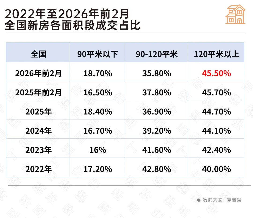 2026年前2个月,全国120平方米以上新房成交占比已经高达45.5%。相当于每卖出两套新房,就有一套是大户型。