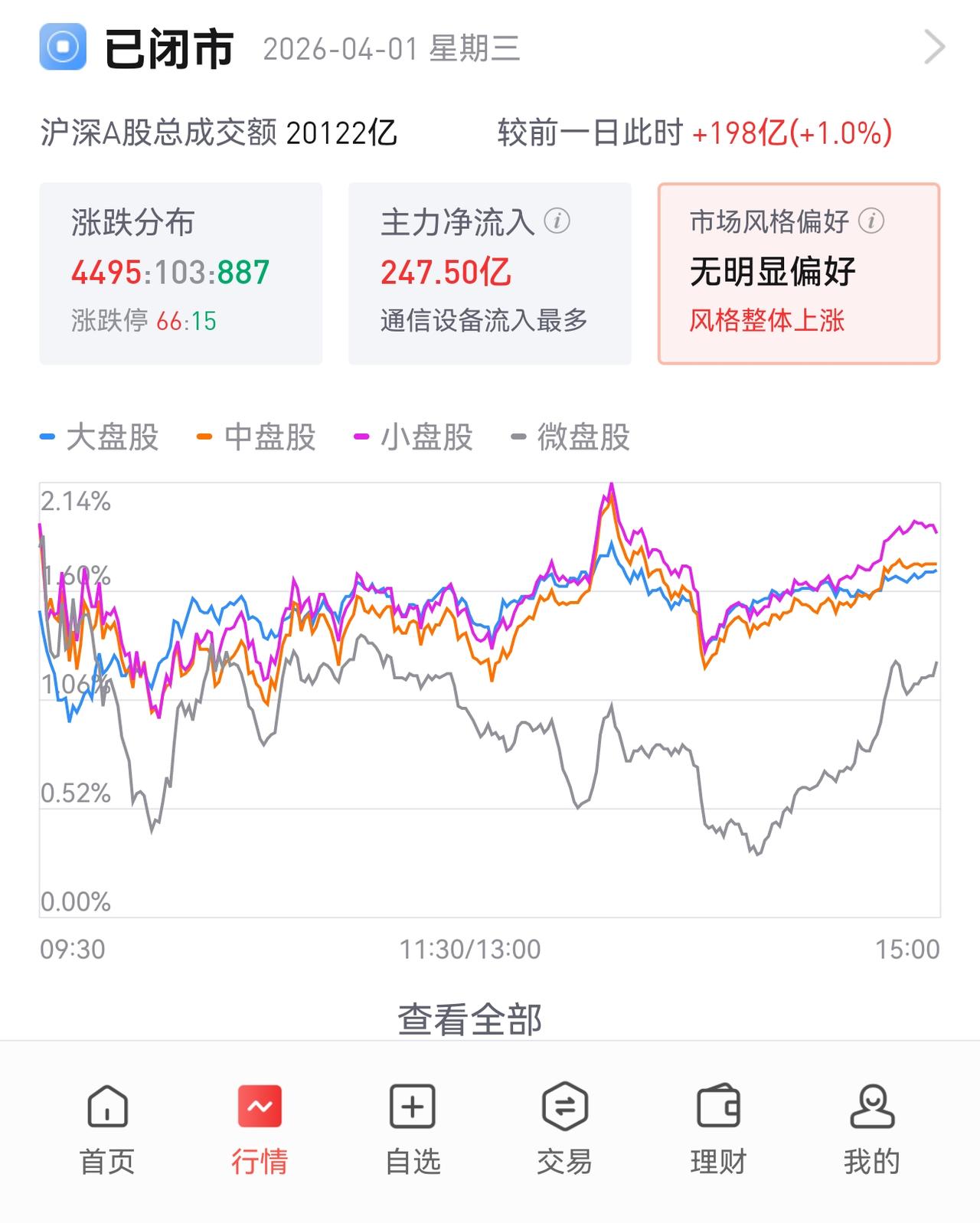 大A重上2万亿,你是继续看涨还是跌? 今天沪深A股成交额重上2万亿,是连续4天跌破2万亿后的首次突破,4495家涨,887家跌。 虽然都是普涨,但是2万亿也不足以支撑反转,加上中东战事还存在变数,我是继续保持震荡意见,短期内的反弹高度应该比较有限,除非是一季报业绩超级亮眼。 你觉得行情反转了吗?欢迎在评论区聊聊。