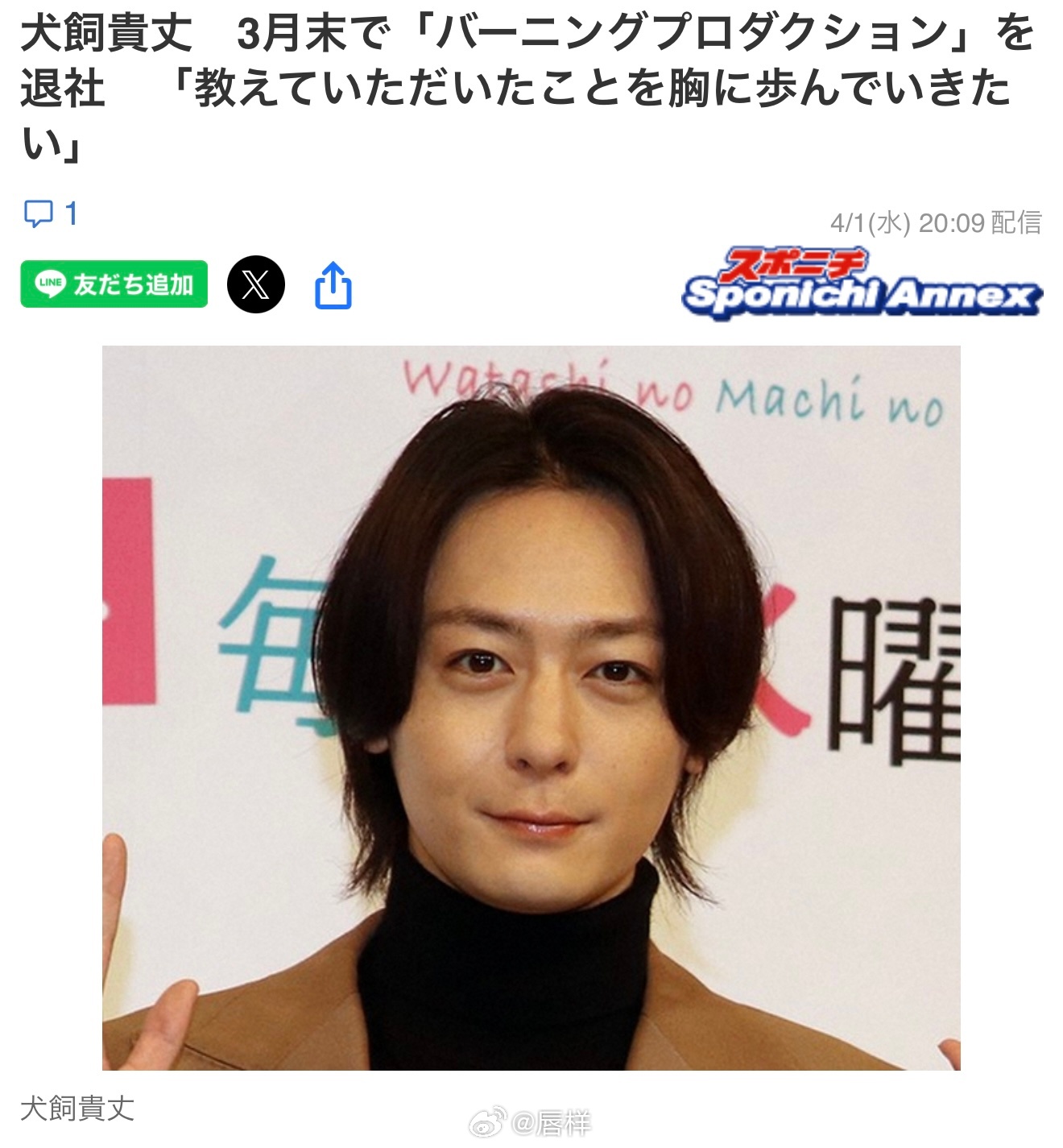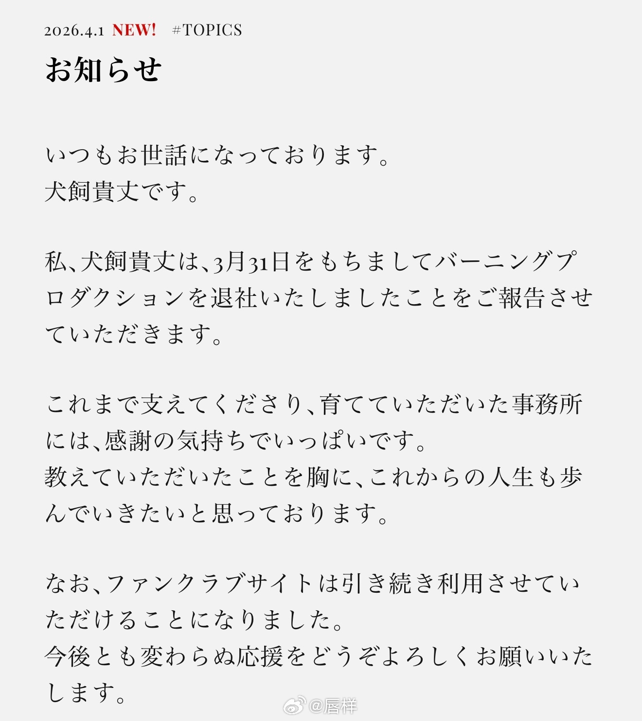 演员犬饲贵丈(31岁)于4月1日更新官方网站,宣布已于3月末退出所属事务所Burning Production。