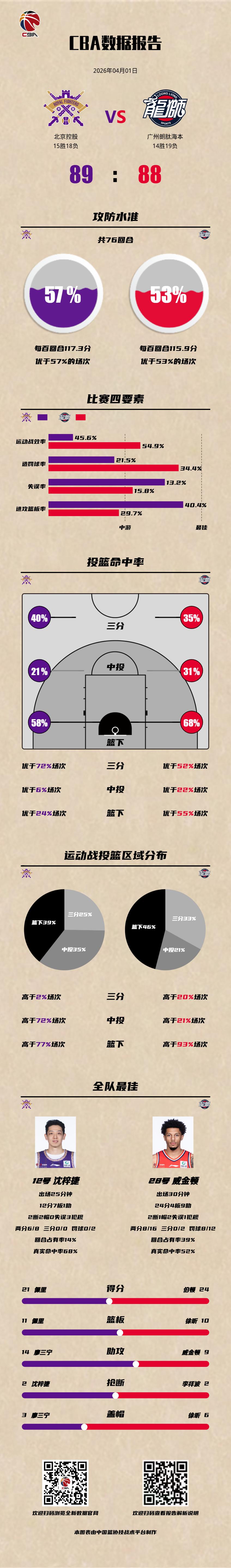 北京控股 89-88 广州朗肽海本 北控男篮vs龙狮男篮 北京控股:佩里21分11篮板,里勒20分,廖三宁11分4篮板14助攻2抢断3盖帽; 广州朗肽海本:威金顿24分4篮板9助攻2抢断,伯顿24分5篮板,徐昕13分10篮板6盖帽。以城之名