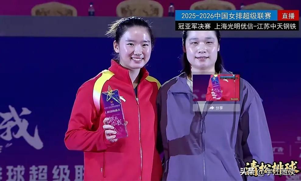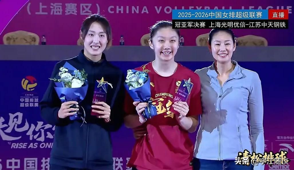 女排联赛最佳阵容: 最佳新人:张籽瑄(江苏) 最佳教练:蔡斌(上海) 最佳主攻:吴梦洁(江苏) 李晨瑄(山东) 最佳副攻:陈厚羽(上海) 杨涵玉(山东) 最佳接应:孙杰(山东) 最佳自由人:倪非凡(江苏) 最有价值球员:王唯漪(上海) 冠军:上海女排(强力外援确实实力强劲) 亚军:江苏女排(一传整体不够稳定,唐欣周页彤强攻能力不足) 季军:山东女排(全华班,年轻球员有进步) 第四名:天津女排(国内球员整体实力一般) 第五名:北京女排(有实力但也有不足) 第六名:河南女排(有进步) 第七名:浙江女排(有冲劲) 第八名:福建女排(庄宇珊很强,其他人很一般)