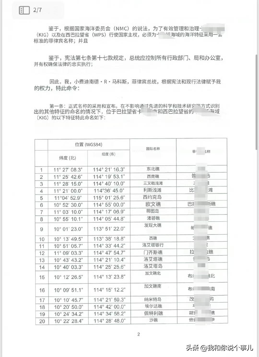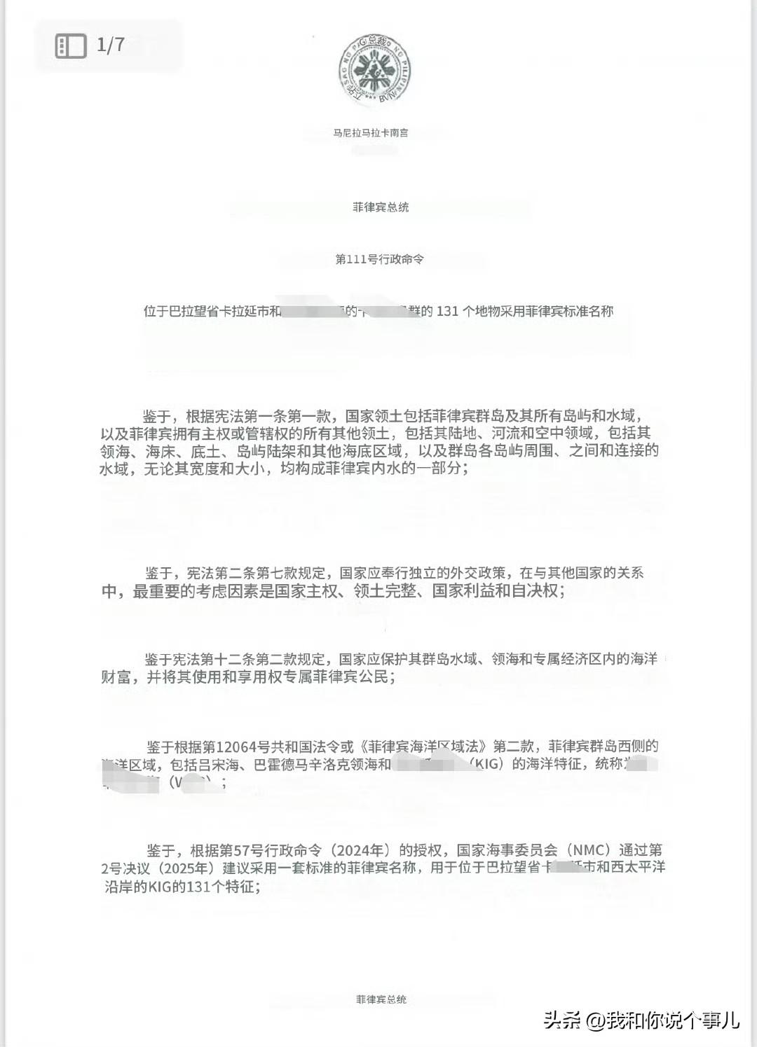 菲律宾总统小马科斯发布第111号行政命令,将中国南沙群岛131处岛礁非法改名。