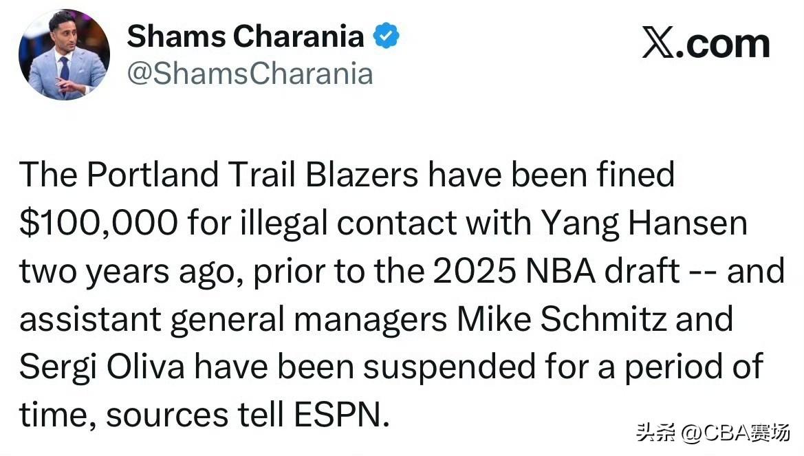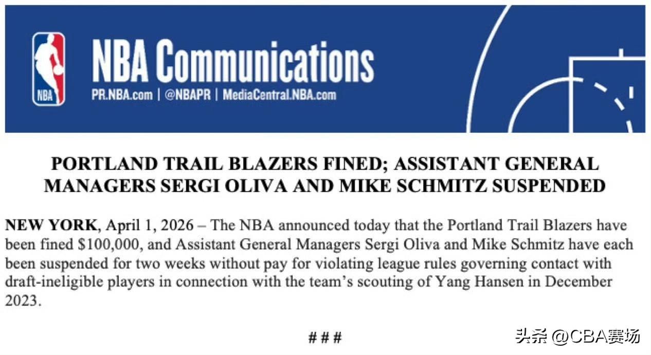 北京时间4月2日,NBA官方公布处罚结果:波特兰开拓者队由于违规私下接触杨瀚森,被联盟罚款10万美元,球队的两名助理总经理迈克·施密茨与塞尔吉·奥利瓦被处以无薪停职两周。