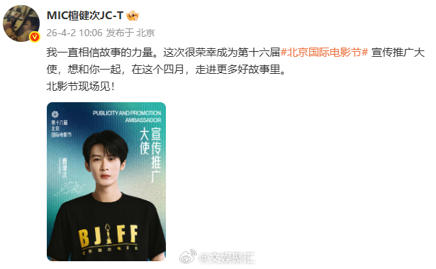 檀健次正式官宣北影节宣传推广大使、 檀健次第16届北影节宣传推广大使檀健次正式官宣北影节宣传推广大使檀健次第 16 届北影节宣传推广大使,用热爱致敬电影,用初心奔赴每一场盛会!