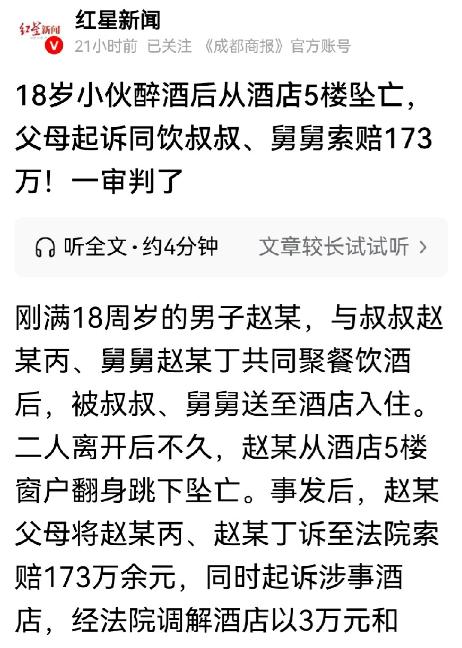 意外还是发生了!广东深圳,18岁的小伙,和自己的叔叔、舅舅一块喝酒,两位长辈看到他有点醉了,就直接给他开了一个房间,把他送到了酒店睡觉醒酒。不料,两人离开后,小伙开门出来,在酒店5楼的窗户跳下坠亡。小伙父母痛不欲生,怨恨两位长辈没有照顾儿子,将两人告上法庭,要求赔偿各项损失173万元,法院这样判。 广东深圳宝安区,一场家庭聚餐后的悲剧,让两个家庭彻底反目。18岁小伙酒后从酒店5楼纵身跳下,当场身亡,悲痛欲绝的父母,将一起喝酒的叔叔、舅舅告上法庭,索赔173万余元,最终法院的判决,让所有人看清了责任的边界。 法院一审判决结果出炉,叔叔和舅舅各自赔偿小伙父母5万元,驳回了其余的索赔请求。与此同时,涉事酒店经过法院调解,赔偿3万元达成和解,这场因一顿酒引发的纠纷,在法理上有了定论,却难以弥合亲人之间的裂痕。 时间拉回到事发当晚,刚满18岁的小伙,和自己的叔叔、舅舅凑在一起聚餐,三人推杯换盏,不知不觉喝掉了3瓶白酒,小伙一个人就喝了大半瓶,渐渐露出了醉酒的模样,走路都有些不稳,说话也变得含糊不清。 看到小伙醉意渐浓,两位长辈没有联系他的父母,而是就近找了一家酒店,给小伙开了一间房,搀扶着他进了房间,简单安顿了几句,见小伙躺下后,便放心地离开了酒店,彼时的他们,从未想过这会是和侄子的最后一面。 两人离开酒店的时间是凌晨0时49分,仅仅不到一个小时,悲剧就悄然发生。监控显示,1时47分,小伙独自打开房门,在酒店走廊里漫无目的地徘徊,还频频敲响其他客人的房门,行为异常,却没人及时察觉和阻拦。 没过多久,小伙走到酒店5楼走廊的尽头,趁着无人注意,翻身爬上窗台,一跃而下,重重摔落在相邻酒店的停车场,等工作人员发现时,他已经没了生命体征,一场原本普通的家庭聚餐,最终酿成了无法挽回的悲剧。 小伙的父母接到消息后,瞬间崩溃,终日以泪洗面,痛不欲生。在他们看来,儿子的死,叔叔和舅舅难辞其咎,若不是两人没有尽到照顾义务,把醉酒的儿子独自留在酒店,悲剧就不会发生,怨恨之下,决定拿起法律武器维权。 他们向法院提起诉讼,要求叔叔和舅舅赔偿各项损失共计173万余元,理由是两位长辈作为共同饮酒的亲属,明知小伙醉酒,却未采取有效监护措施,也未联系其父母,未尽到合理的注意义务,应当承担赔偿责任。 法院审理后查明,小伙已是完全民事行为能力人,自主跳窗的行为是导致其死亡的主要原因,应当自行承担主要责任。但叔叔和舅舅作为长辈,确实未尽到合理监护义务,存在一定过错,最终酌定两人各赔偿5万元。 事发时酒店工作人员曾发现小伙醉酒后行为异常,将其送回房间,却未后续跟进查看;两位长辈也忽略了醉酒后小伙的失控风险,没有留下专人陪护。如今,赔偿款已经尘埃落定,可失去儿子的痛苦,和亲人反目的遗憾,却难以消散。 对此,你们有什么看法,欢迎评论留言~