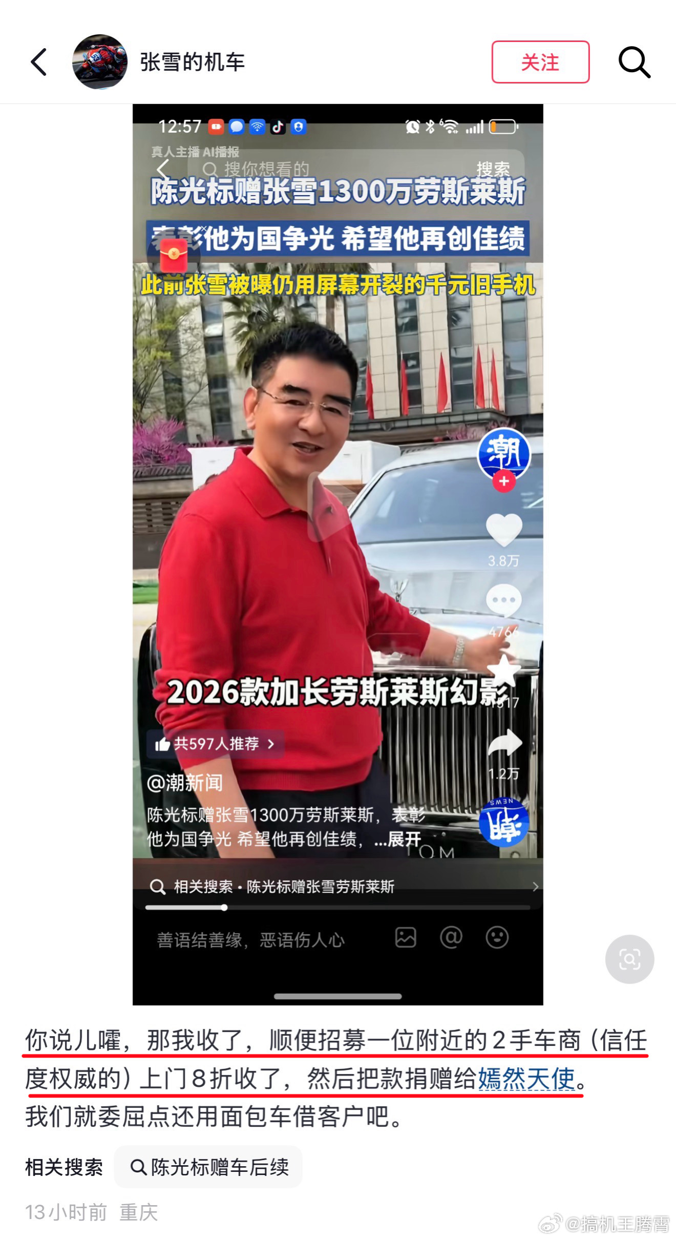 哈哈哈,笑死,想蹭流量是吧,陈光标说要送张雪1300万的劳斯莱斯,谁知张雪不按套路出牌,随后就说车他收了,顺带找两个二手车商8折卖了,然后把钱捐给嫣然天使基金,现在压力来到标哥这边了,你们猜猜陈光标真会把劳斯莱斯送张雪吗?