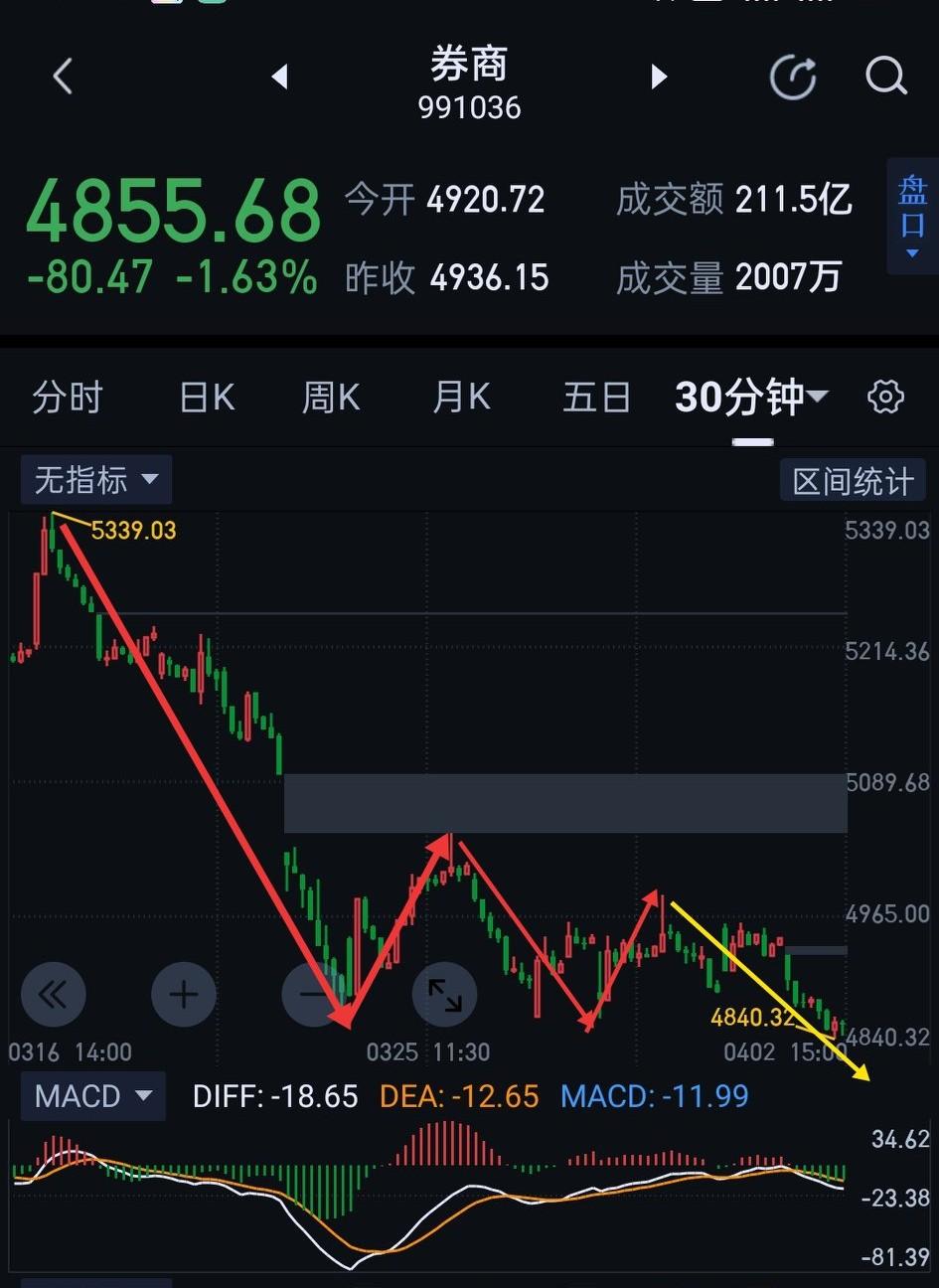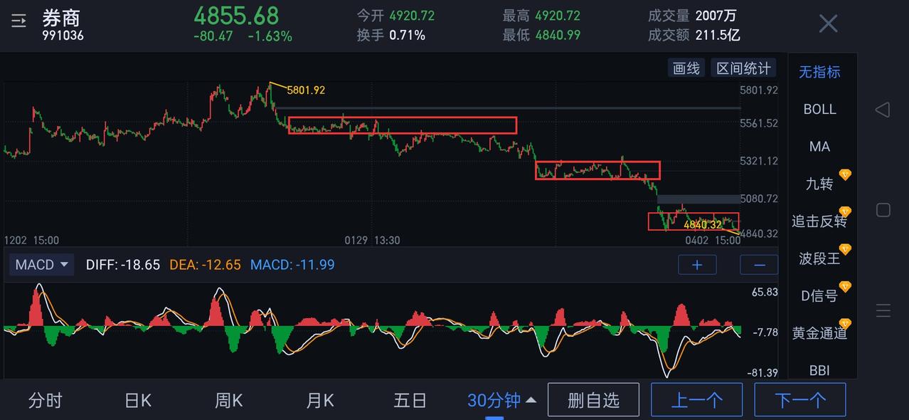 券商板块,恐慌性杀跌或近极致。 券商从5801开始的日线一笔下,在次级别已形成第三个五分钟中枢。如围绕该中枢形成背驰,可当左侧一类买点来把握。(或近期形成明显带量日线底分型)均有望成为该笔日线下结束的信号。 细节上,明天能否有效站稳4840是关键。站稳,从4977开始的三十分钟一笔下将有望结束。若不能站稳, 则需等待新的一分钟中枢形成的背驰结构。 券商目前走势很大概率是在制造空头陷阱,恐慌中选择"断舍离"要慎重。