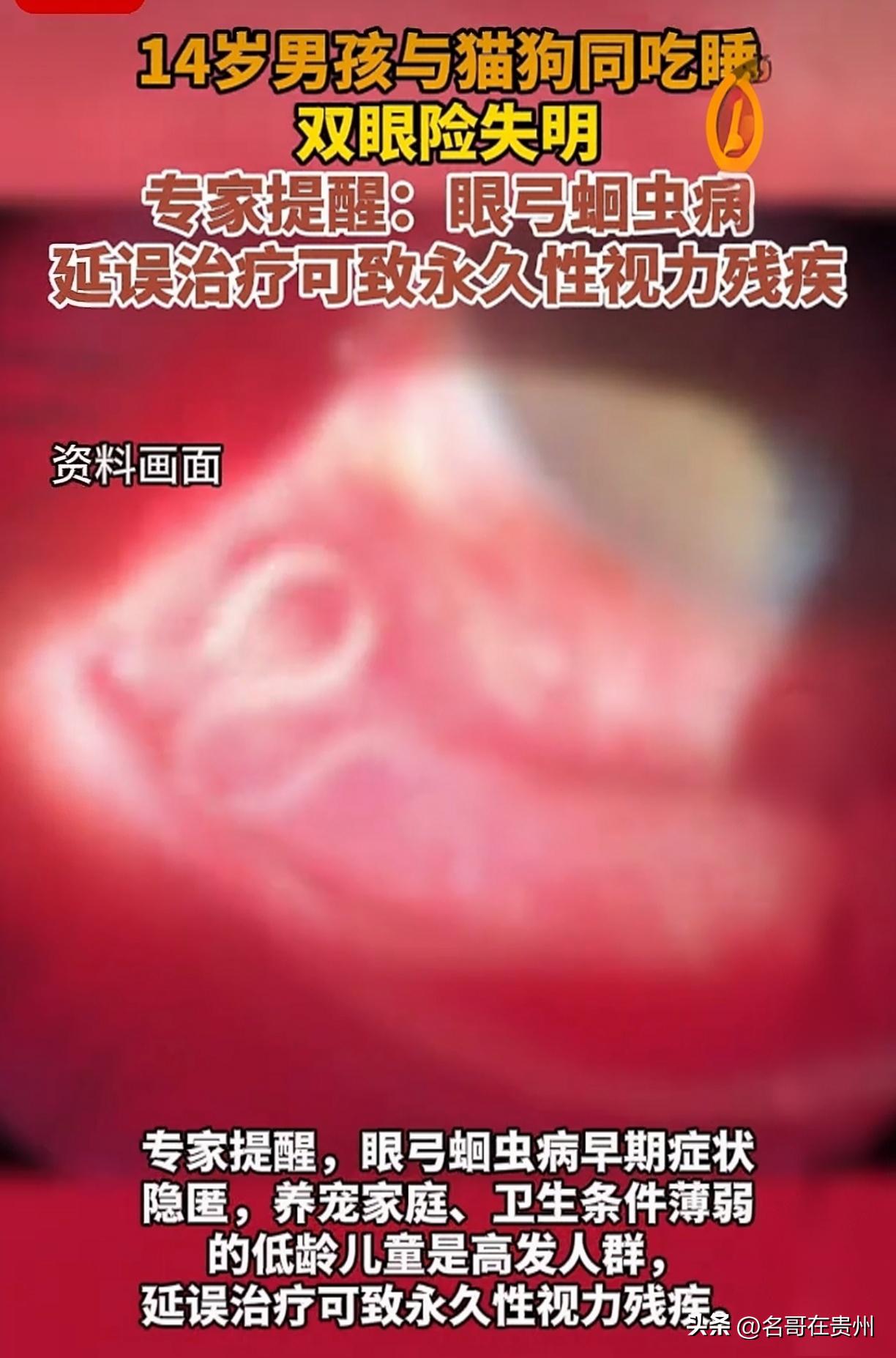 14岁男童近乎失明!医生痛心:这习惯很多家庭都有 跟猫狗同吃同睡一年多,湖北这个14岁男孩的眼睛,彻底废了! 视力检查结果出来那一刻,连医生都直摇头:右眼0.02,左眼0.1。 这是个什么概念?站在视力表前,最大的那个字母他都看不清。这不是天生的悲剧,而是实打实的“人祸”。 这绝不是耸人听闻。 湖北京山14岁的小宇(化名),因为父母长期在外打工,他是跟着爷爷奶奶长大的留守儿童。家里养了猫和狗,这孩子孤单啊,平时就跟毛孩子腻在一起,不仅同桌吃饭,甚至同床睡觉。平时玩泥巴、摸宠物,随手擦擦眼睛,家里人也都没当回事。 直到一年前,小宇开始喊眼睛模糊,成绩直线下滑,家里人还以为是他偷懒不想写作业,根本没往“瞎”那方面想! 直到最近实在看不清了,送去武汉的大医院一查,在场所有人都倒吸一口凉气。 他的眼睛里,竟然长满了弓蛔虫! 主治医生一看就明白了:这是典型的“宠物亲密接触后遗症”。 那些我们肉眼看不见的寄生虫卵,通过猫狗的毛发、粪便传到孩子手上。孩子卫生习惯差,不洗手就直接揉眼睛、吃东西,虫卵就这样进入体内,随着血液循环,“钻”进了眼球里。 更可怕的是,这虫子不仅在眼睛里吃喝拉撒,还到处“打洞”。 由于发现得太晚,小宇的视网膜已经遭到了不可逆的损伤。医生说,这视力,能保住不失明就算万幸了,想恢复如初?基本没戏了! 其实,这样的悲剧远不止一例。 就在前几天,深圳也曝出一个8岁男孩中招,还有个5岁女童只是因为在小区沙坑玩沙子,也没能幸免——因为流浪猫狗常在沙坑里大小便。 这件事,真的给所有家长敲响了警钟! 别觉得自家宠物打了疫苗就万事大吉,弓蛔虫这东西,防不胜防。 尤其是留守儿童家庭、养宠家庭、以及卫生习惯差的孩子,绝对是高危人群。 很多家长觉得“孩子喜欢猫狗是善良”,但“爱”和“害”往往只在一念之间。 你家孩子也养宠物吗?你会允许猫狗上床、上餐桌吗? 欢迎在评论区留言,把这个案例转发给更多家长看到,别让我们的粗心,毁了孩子一辈子的光明! 作者申明: 本文内容根据《极目新闻》2026年4月1日报道及光明网相关病例科普整理,仅作警示参考。