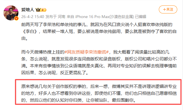 乐评人解读李荣浩被质疑 乐评人解读李荣浩被质疑相关内容:在《小眼睛》这首歌上,李老师仅仅拥有署名权,不具备版税收益的权利,而他的署名权,也是在他稀里糊涂错误打包卖出自己扒带 Demo 后产生的…想撤掉这首歌,从词曲拥有者的角度,他也没这话语权了。解释清楚了以上这些并不算容易理解的业界规则,就知道李老师没说谎啊。