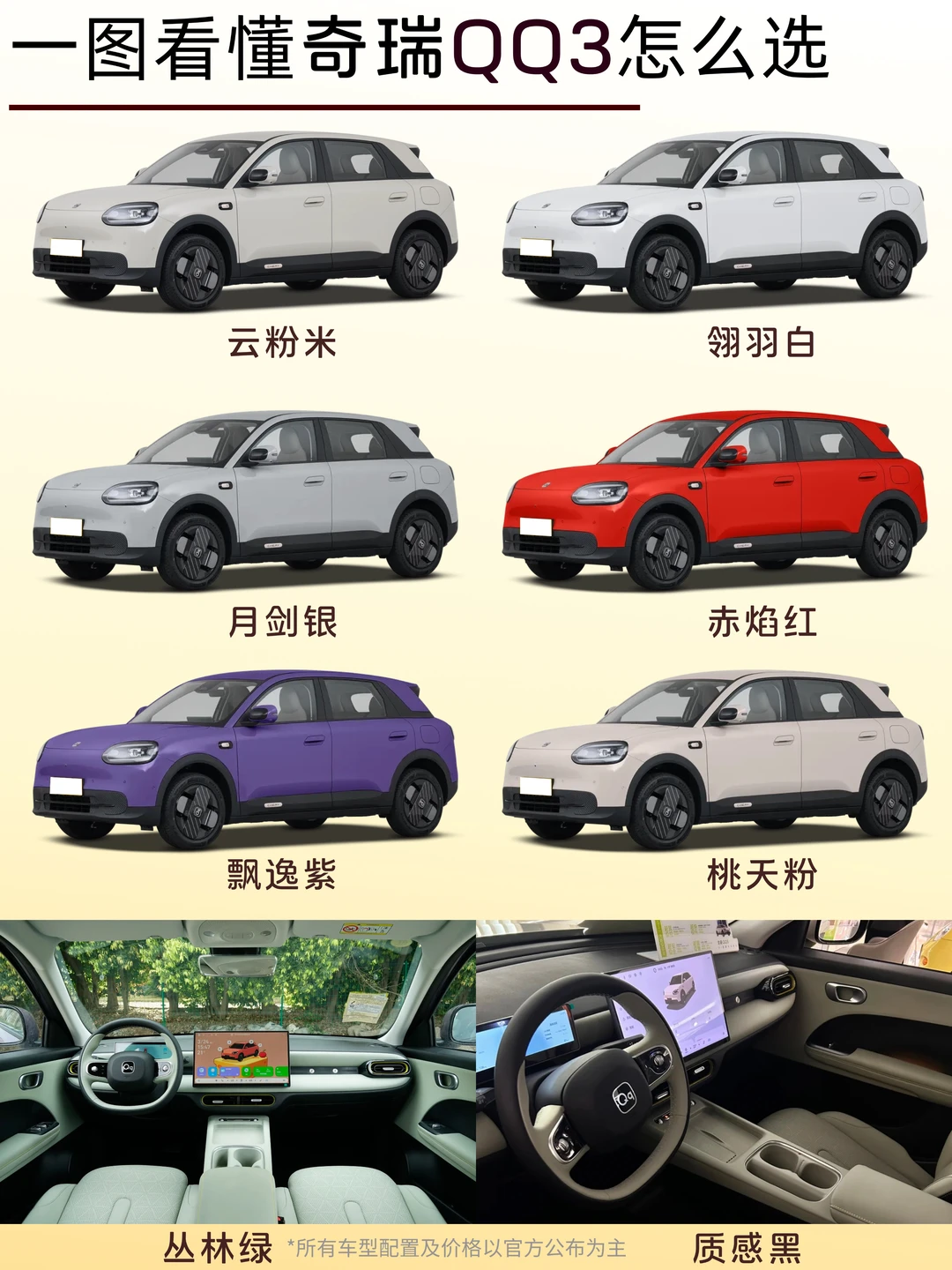 想买奇瑞QQ3EV不知道买啥配置,看完这期你就知道啦~ - 🚗外观 经典萌系小车,线条圆润小巧,前脸简约耐看,搭配规整的大灯组,辨识度在线。🔺车身尺寸紧凑灵活,无论是小区窄路还是商场车位,停车掉头都毫无压力 - 🖥️内饰 座舱布局简洁规整,设计以实用为主,座椅填充柔软,日常短途乘坐舒适度强,🔺车内储物空间布局合理,随身小物件都有地方放。车内基础功能分区清晰,操作简单好上手 - ⚡动力 全系为纯电驱动,电机输出平顺安静,起步轻快,市区代步超车、跟车都很从容。🔺日常用电成本低,养车几乎无压力~ - 💡智能化 搭载基础实用的车机功能,满足日常听歌、导航、手机互联等核心需求,操作流畅不卡顿。🔺部分版本配备语音控制功能,开车时操控功能更安全便捷 - 🛡️安全 搭载高强度车身结构,标配基础安全气囊,配备倒车雷达、倒车影像等泊车辅助配置,🔺新手停车更轻松,能有效减少刮蹭风险。后排配有儿童座椅接口,带娃短途出行也更安心 - 📦空间 前排乘坐空间宽裕,后排容纳两名成年人短途出行完全够用。后备箱能放下背包、买菜袋等日常物品,后排座椅还可放倒拓展空间,偶尔放置婴儿车、小行李也没问题,实用性强 - 👉🏻各个配置咋选? 🔺310km热爱版 价格亲民,核心代步配置齐全,续航满足日常短途通勤、买菜接娃,适合纯市区代步、预算有限的通勤党 🔺310km分享版 在入门版基础上升级中控大屏、倒车影像,舒适性和便利性提升,日常家用代步性价比高 🔺420km热爱版 续航里程更长,不用频繁充电,适合通勤距离稍远、不想经常补能的用户,通勤代步省心 🔺420km分享版 配置全面拉满,新增更多舒适和智能配置,用车体验一步到位 - 看完知道怎么选了吗?