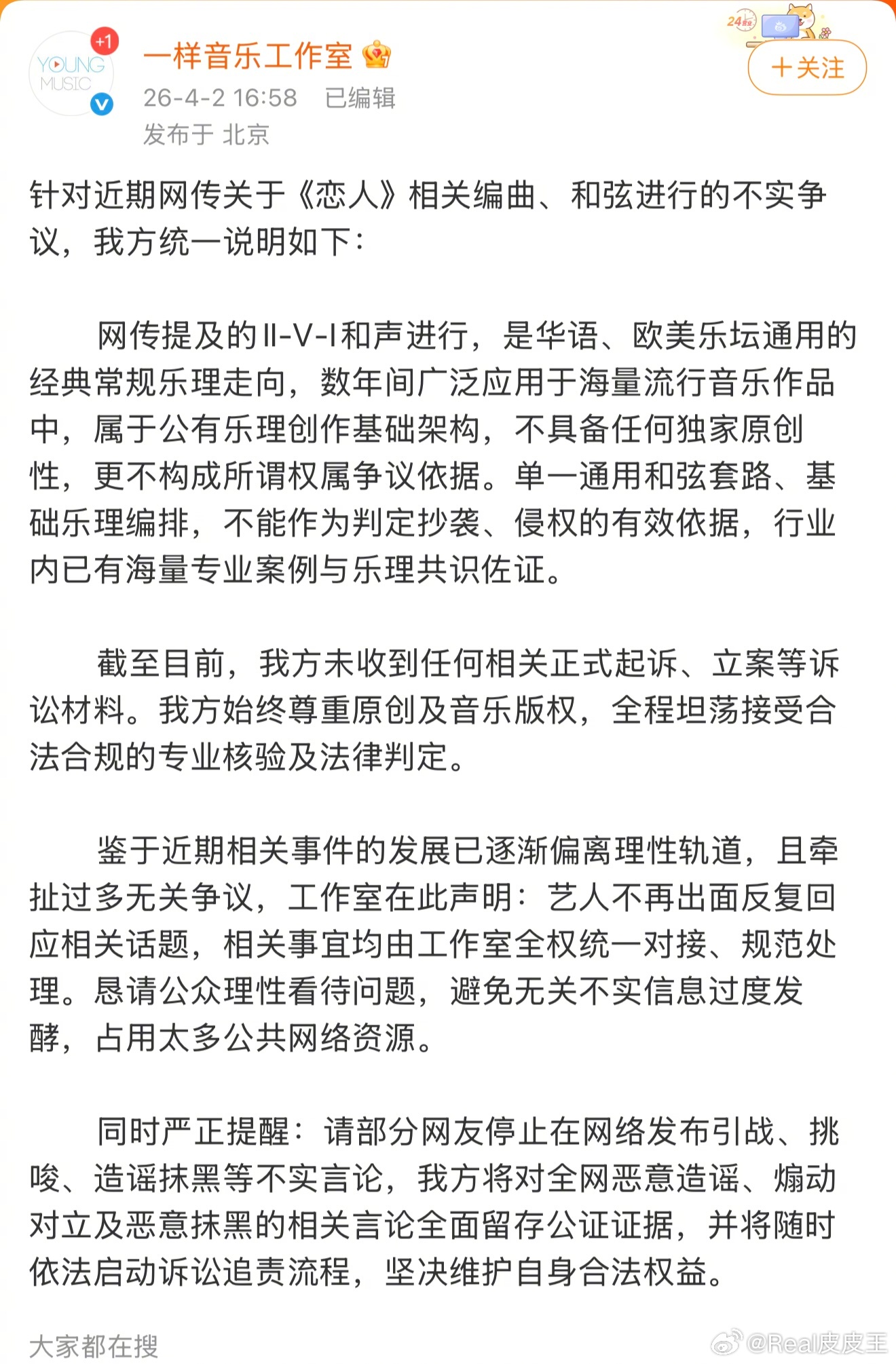 李荣浩公司方否认《恋人》抄袭,称目前没有收到任何起诉材料,但对于热搜了一整天的网