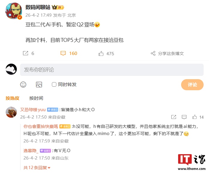 有网友猜测博主所指的两个大厂是“h”和“O”,但随后有其他网友否认了该说法,表示“h”有自己研发的大模型所以不可能。同时他认为“H”和“M”也不太可能,所以应该是剩下的厂商在洽谈(IT之家注:H预计指华为、h预计指荣耀、M预计指小米、O预计指OPPO、V预计指vivo)。