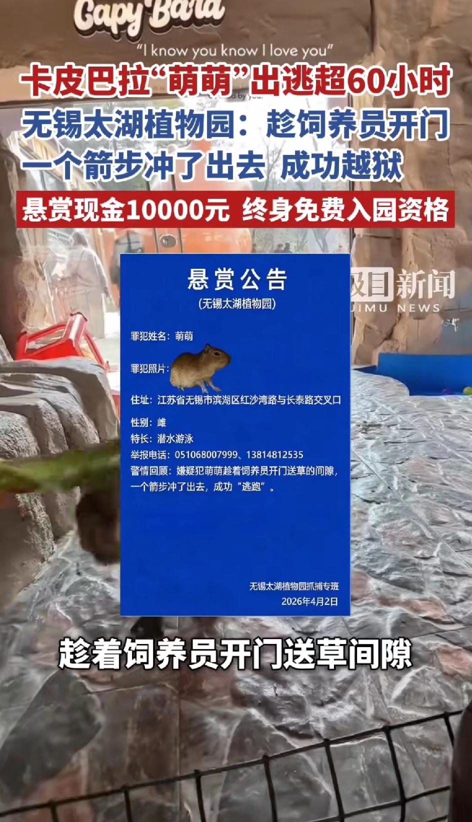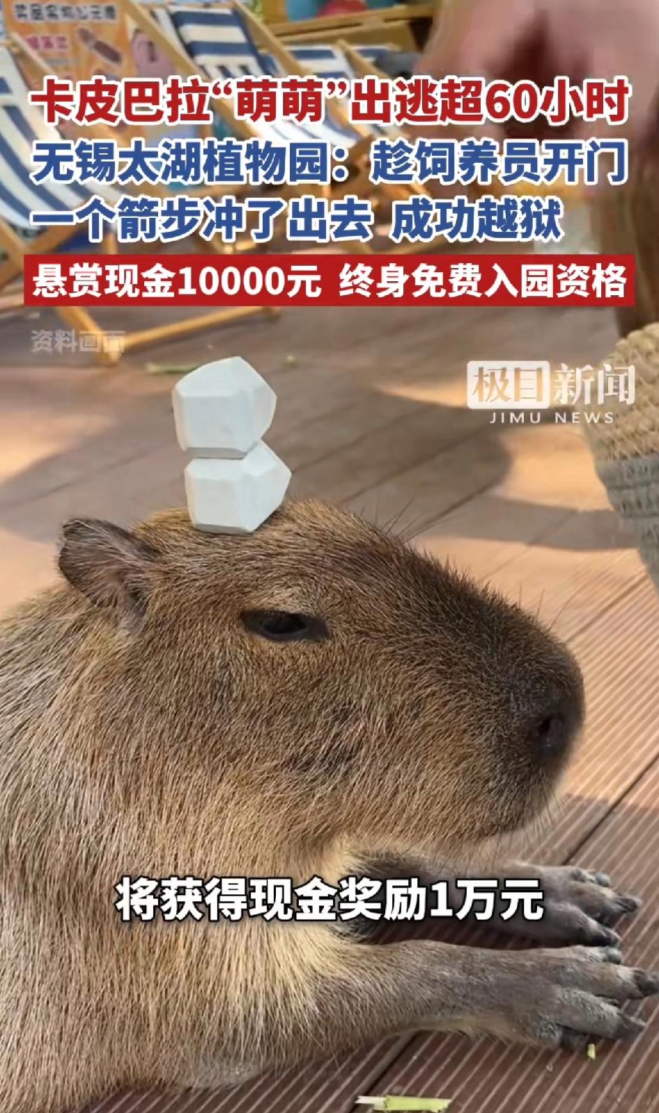 卡皮巴拉“萌萌”出逃60个小时,无锡太湖植物园:趁饲养员开门一个箭步冲了出去,成功越狱。