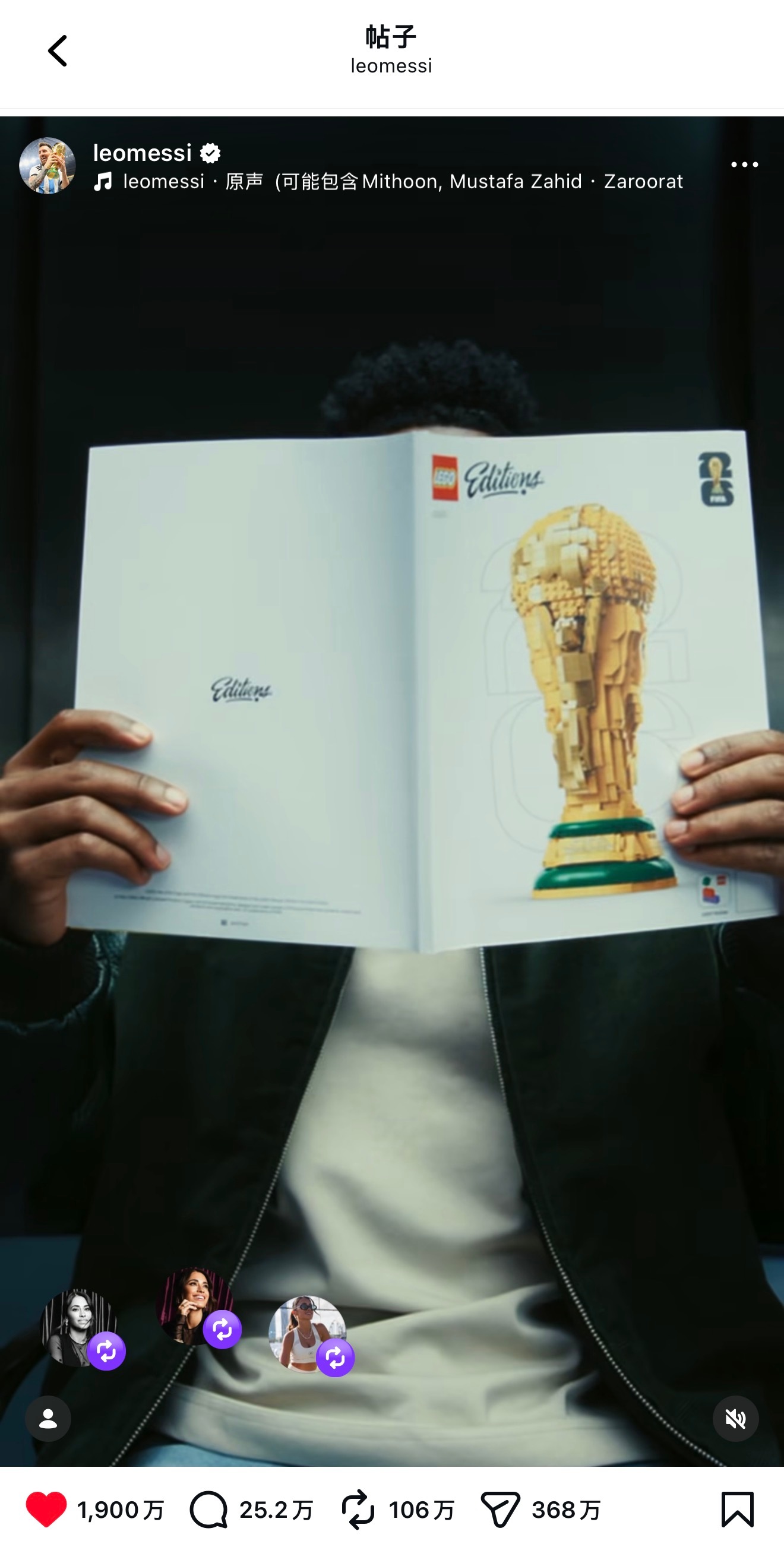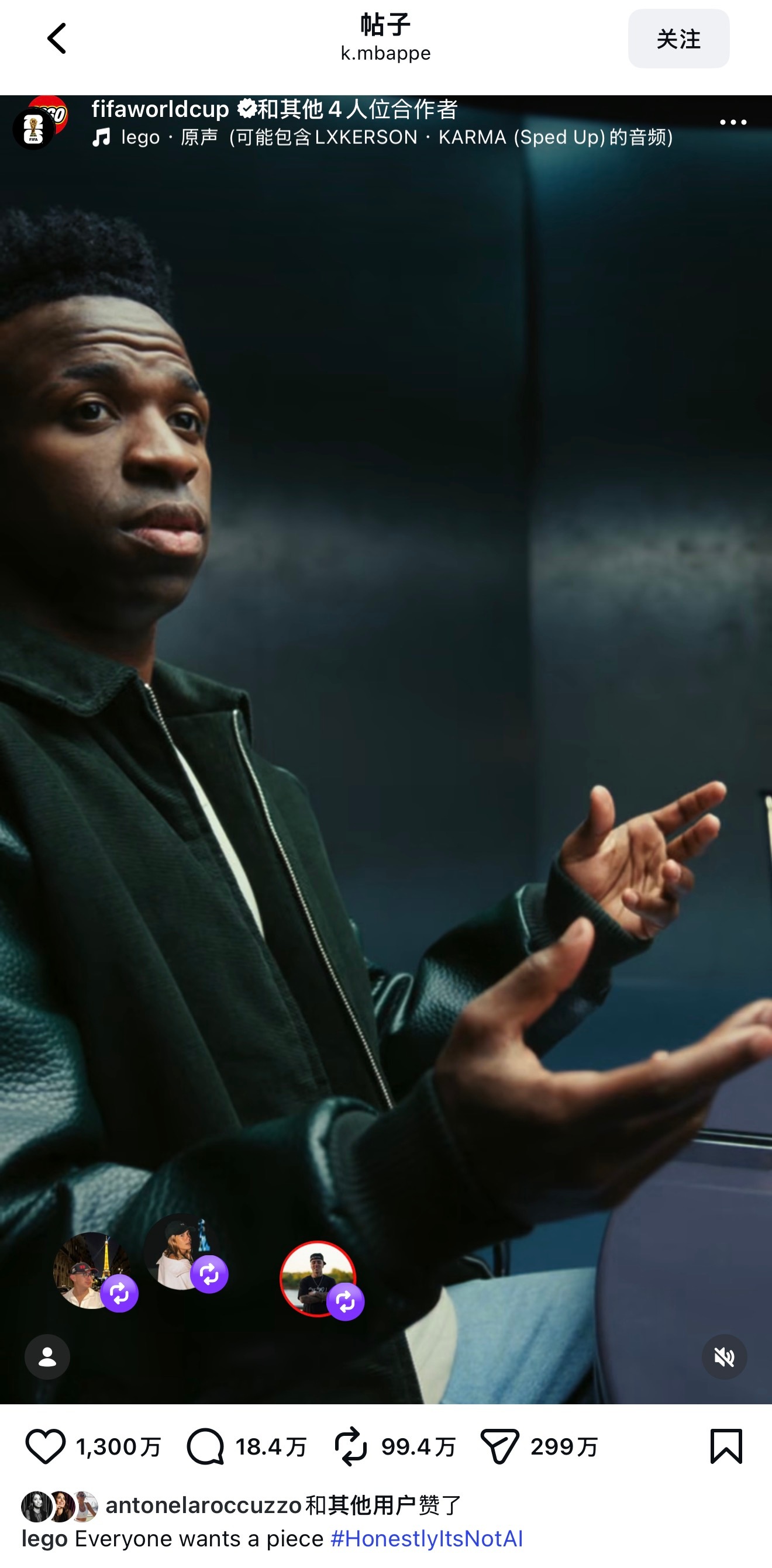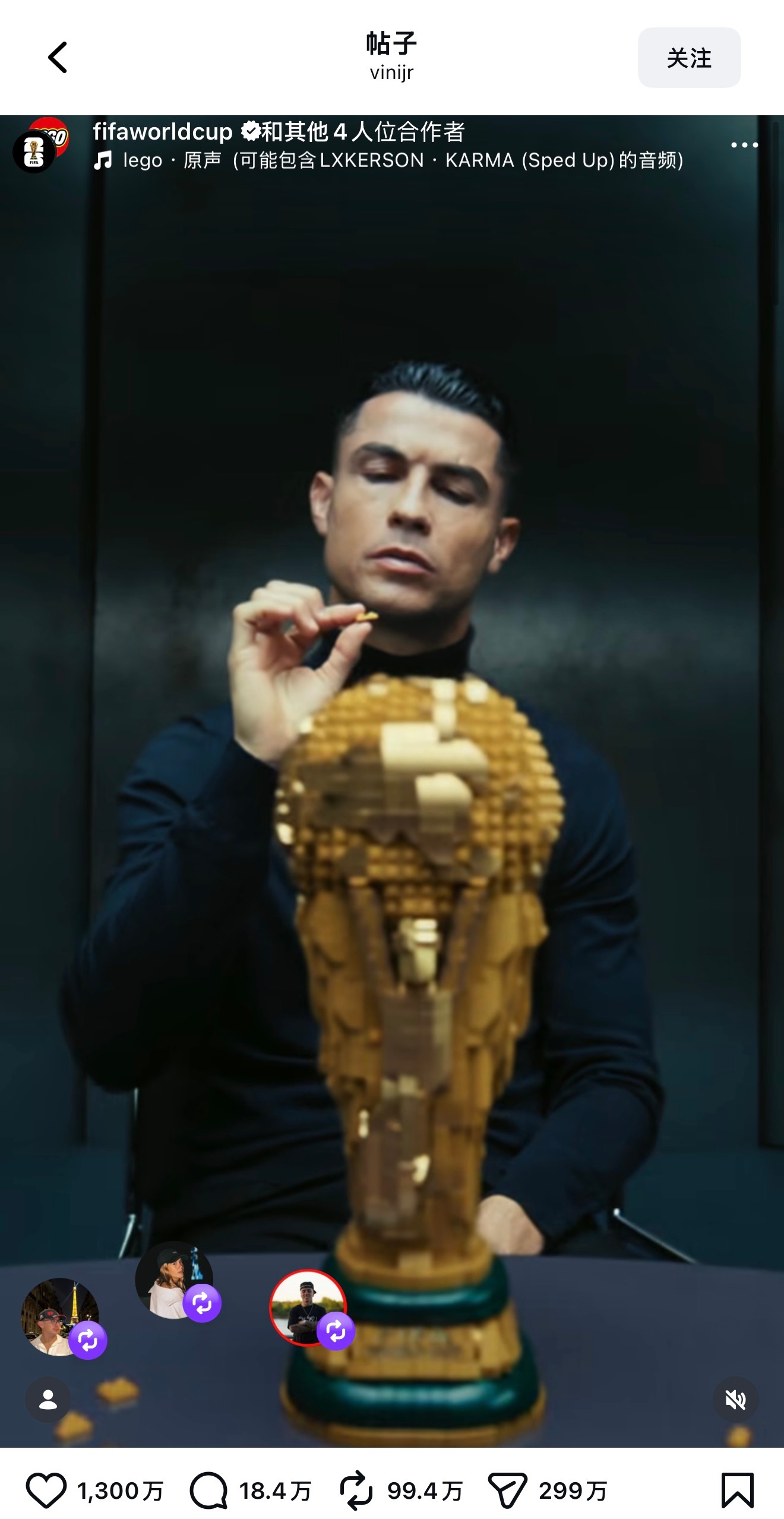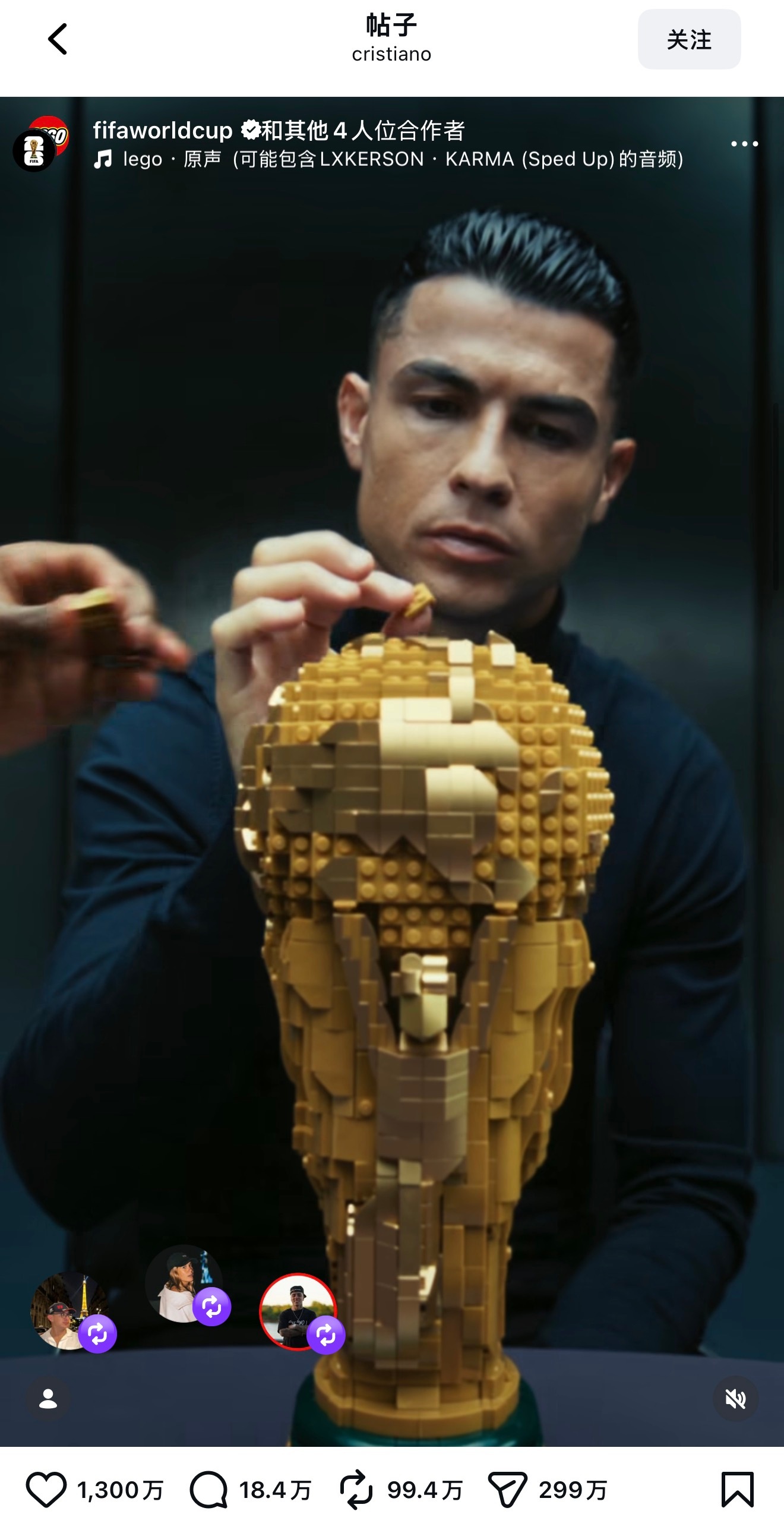 C罗梅西世纪同框 乐高的世界杯广告贴,同一时段发布,梅西IG个人的点赞数,遥遥领先C罗、姆巴佩、威尼修斯三人的共创贴。