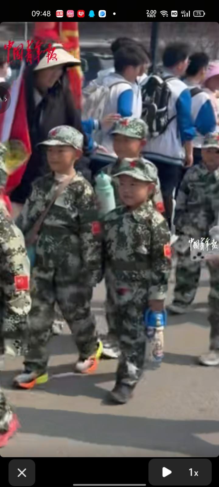 4月2日,德州市庆云县。职场少年赴冀鲁边区革命纪念馆缅怀先烈,途中与身穿迷彩服的幼儿园小朋友队伍不期而遇,两个队伍互相招手鼓励。那一刻,他们遇见了以前的自己和未来的自己。