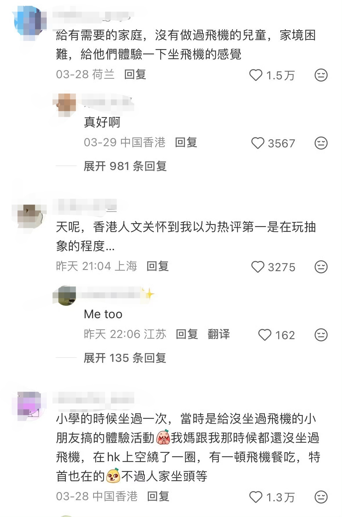 国泰、香港航空等也常与慈善机构合作,推出公益圆梦航班,免费带领贫困儿童、长者、残障人士体验完整的乘机流程,圆普通人的飞行梦。