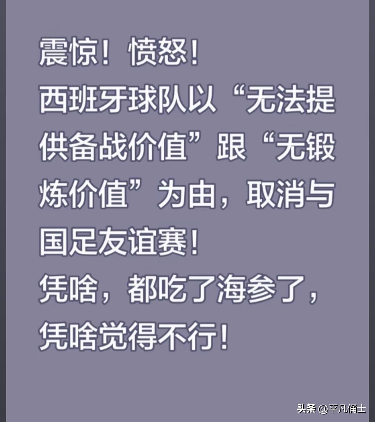 西班牙取消和中国国家队的友谊赛,人们说是伤害性不大,侮辱性极强。其实大家错了,应该是西班牙怕了。 原定于6月4日的西班牙国家队同中国国家队的友谊赛,被西班牙足协认为锻炼价值不大,还要消耗队员体能为由取消了。一时间,中国足协没有表态,而是中国球迷坐不住了,认为这是西班牙对中国足球的侮辱。现实真的是这样吗?也真是这样,足球也是人情世故,你没有实力,你也就没有地位和尊严。中国足球这水平,哪里能赢得对手的尊重。西班牙对中国队,赢了是应该,是实力的体现。输了不利于大赛前自信心的建立,在万一有个伤病那更得不偿失。所以,西班牙是真的怕了,怕了中国队真刀真枪的和他干,我们没有比赛,但我们已经赢得了比赛。所以祝贺中国足球队在对阵西班牙的比赛前,成功吓退对手。