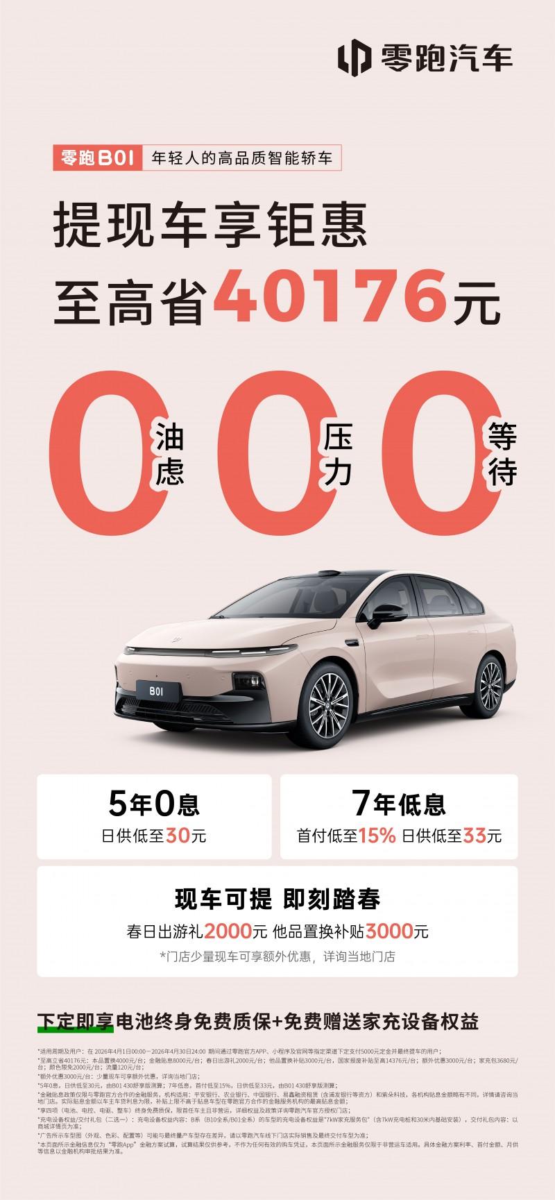 B01-假期收官别 emo,4 月超大权益帮年轻人轻松拿下第一台车! 小长假即将收尾,是不是更体会到有台车的方便?不用挤高铁、不用等公交,想走就走的快乐太上头。刚工作两三年,想买车又怕月供压力大? 那还蛮建议,去看看零跑B01。零跑上个月全系交付破5万,所以这个月在搞那个全系权益,最高能省5万+。其中这个B系列,还有5年0息,贷10万月供才1600多,压力比想象中小很多。而且终身质保,电池电机都保,不用提心吊胆担心修车花大钱。 最主要,用电跑,一公里不到一毛钱。周末想去周边玩,说走就走,不用算油价。那种“想出门就能出门”的自由,真的比省那点油钱更值。 总之,年轻人别被“买车养不起”的老观念困住,4月现在零跑有优惠,同时还将全系搭载智能辅助假期,现在买车可能比你想象中轻松得多,最近想看车的朋友,可以趁假期多去门店体验看看。【来自懂车帝车友圈】