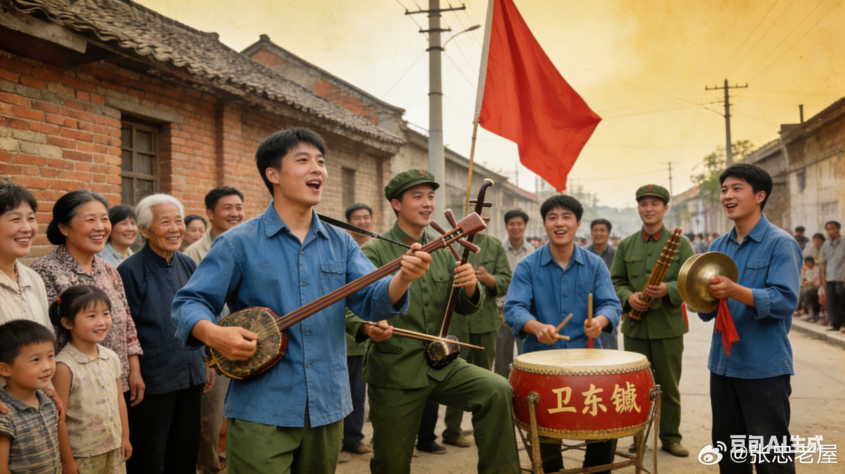 文:老屋张忠;图:AI//2700字许多朋友问我,向东公社“卫东镳”文艺宣传队长啥样?我也无法回答,只晓得他们扛上文艺宣传队的旗帜,经常在东流街头和剧院、大礼堂舞台表演,时间是1966年至1970年之间。记忆中的向东公社 “卫东镳” 文艺宣传队,随着时光的流逝,有些人和事都已忘了......遗憾的是,那个贫困的年代里,鲜有人用镜头记录下东流文艺宣传队表演场景。万般无奈之际,笔者投喂AI原材料,请它为我们东流向东公社“卫东镳”文艺宣传队做一批图片。我想,让这些张图片为我们再现 1966 至 1970 年间,向东公社 “卫东镳” 文艺宣传队在街头表演的历史场景。动笔之前,笔者盘算了一下,要想写好那段“非常时期”的老街青年们的形象,首先要避开当年的“政治术语”,还要避开“全景式”描写,这样一来,真实感就要大打折扣,思绪再三,全景式的细节无法描写,就从粗略的“名单”和老街记忆写起吧——早先,文艺宣传队从一号旗手高松义的单位——西门江堤下东流堤委会出发,向十字街进发。途经学湖后梢、岸边堆满酒糟的荷叶塘,过一座石板桥,便进入城外西街了。进入西街第一家,便是东流著名的模范青年民兵、渔民积极分子朝改英的家。你们知道吗?那一年,从东流到东至,从江南到江北,从池州到安庆,在座无虚席的大会会场里,在车站码头、街道乡村,凡是有广播、报纸的地方,“朝改英”的名字代表着地方最时髦的政治术语。笔者那时还是个未成年的“小屁孩”,为同学朝阳佬有这样一位“响亮”(名称)的姐姐感到骄傲。一个人的事迹也好,一条老街的古迹也罢,要想声名远扬获得一定影响力,得力于传播的力度和广度,在时光悄悄过去的六十年前,“卫东镳”文艺宣传队致力于口头、肢体语言的传播,其本身的影响力也是空前的、划时代的,随着历史不断地翻篇,他们的“行为艺术”不应该被时光忘记,在老街地方史上,有必要记上一笔。经过几位亲历者努力回忆,所能回想起来的名录如下——文艺宣传隊队员:陈彩凤、汪世美、徐萍、胡家声、何定一、颜菊霞、余彩霞、周彩霞、金月霞(东街不是北街)、安宁波、王宗应、高良琴、高菊衡、刘立春、佘建生(大马S)、周春梅、严滿红、金来娣、雕刻章的小张、方耀坤、方某平、金银炉、小扁、何其贞、汤永勤、江龙全、郭桂芳、王玉英、鲍劲松、陈其康、居雪多、周时佩......五七大隊旗手高松義、汤永勤、黄锦栋他们参与了本文的回忆;鸣谢:向东五七文艺宣传队补录名单(21人):张国华、李国霞、刘可元、高贞淑、方家怀、严满红、张三久、张桃红、李国莲、李国凤、金华芝、张玲芳、金云菊、邹强梅、朱菊霞、魏光先丶胡玉庭、章小华、鲍立新、高淑珍、雷炳霞......感谢那些年,由向东公社、五七大队、东流文化馆等多家牵头的多支文艺小分队,成为走基层为工农兵服务的文艺轻骑兵。在没有电话电视、没有手机的年代,普通居民家里连收音机、报纸都是稀罕之物,寂静的老街封闭保守,身在东流堤管会的转业老兵高松义,敏锐地观察到这一点,就用积蓄买了一台小收音机。这样,自己就可以第一时间收到来自党中央的声音和《人民日报》最新消息。他想把最新消息传达给老街居民,就去“五七”大队部找民兵营长汤永勤商议,正好大队会计黄锦栋在场,三个人达成一致意见:走街呐喊,用土喇叭把收音机里把听到的中央早播告诉街坊邻居。他们最先的走街活动迎来好奇目光,慢慢地有四零后知识青年加入土喇叭宣讲。突然有一天,他们觉得这种宣讲太古板、教条,不如用表演唱的形式来得活泼、自然,也是群众喜闻乐见的宣传形式——这就是他们经历的由“宣讲”到“演唱”的过程。果然,向东公社 “卫东镳” 文艺宣传队的到来,犹一声春雷,炸开了老街封闭的青石板,街头文艺表演唱一下子激活了人们的精神需求,那些久旱的渴望,在1966年的夏天迎来了一场降雨。青年男女冲破世俗化的束缚,为老街民众送来甘露,向青砖灰瓦注入一腔活力,固化的老街如一江春水穿流不息,顷刻,走街串巷的锣鼓声让老街日夜沸腾起来。1966年前期,宣传队员以四零后后为主,从1967年之后,始有五零后后加入,1968年,五零后加入文艺宣传队达到高潮,占据了全体队员年龄段的半壁江山。队员们演出场地在东流老街十字街口、东方红广场、百货大楼、车站码头、郊区厂矿、社队等露天场所,也在东流影剧院、东中大礼堂(老东流县委礼堂)等室内演出。甚至还到东流大闸建设工地慰问挑闸贫下中农(农民工),也和东中学生以及外来串联学生、下放和回乡知青联合演出。文艺队员们深入群众,在街头巷尾进行表演,用文艺的形式宣传政策、鼓舞人心,成为了当时社会生活中一道独特的风景线,也承载了许多人对于那个年代的集体记忆。青年男女载歌载舞,锣鼓喧天,热情高涨、激情燃烧;观者也是心潮澎湃,举旗挥舞、青春律动,鼓掌声、口号声热烈地盖过了锣鼓声,看热闹的人群簇拥着表演队伍,长街挤得水泄不通,人群不分男女老少,个个像被狂风卷起的波涛一般激荡,生活的情趣一浪高过一浪......更有那着了魔一般的红袖章,分不清观众还是演员,跃上台阶,站在高处用土喇叭喊着流行口号,把演出氛围引上高潮。看客被感染的情绪在空气中弥漫,一波接一波的声浪在大街上激昂起来,用山呼海啸来形容也不为过。文艺宣传队是那个特殊