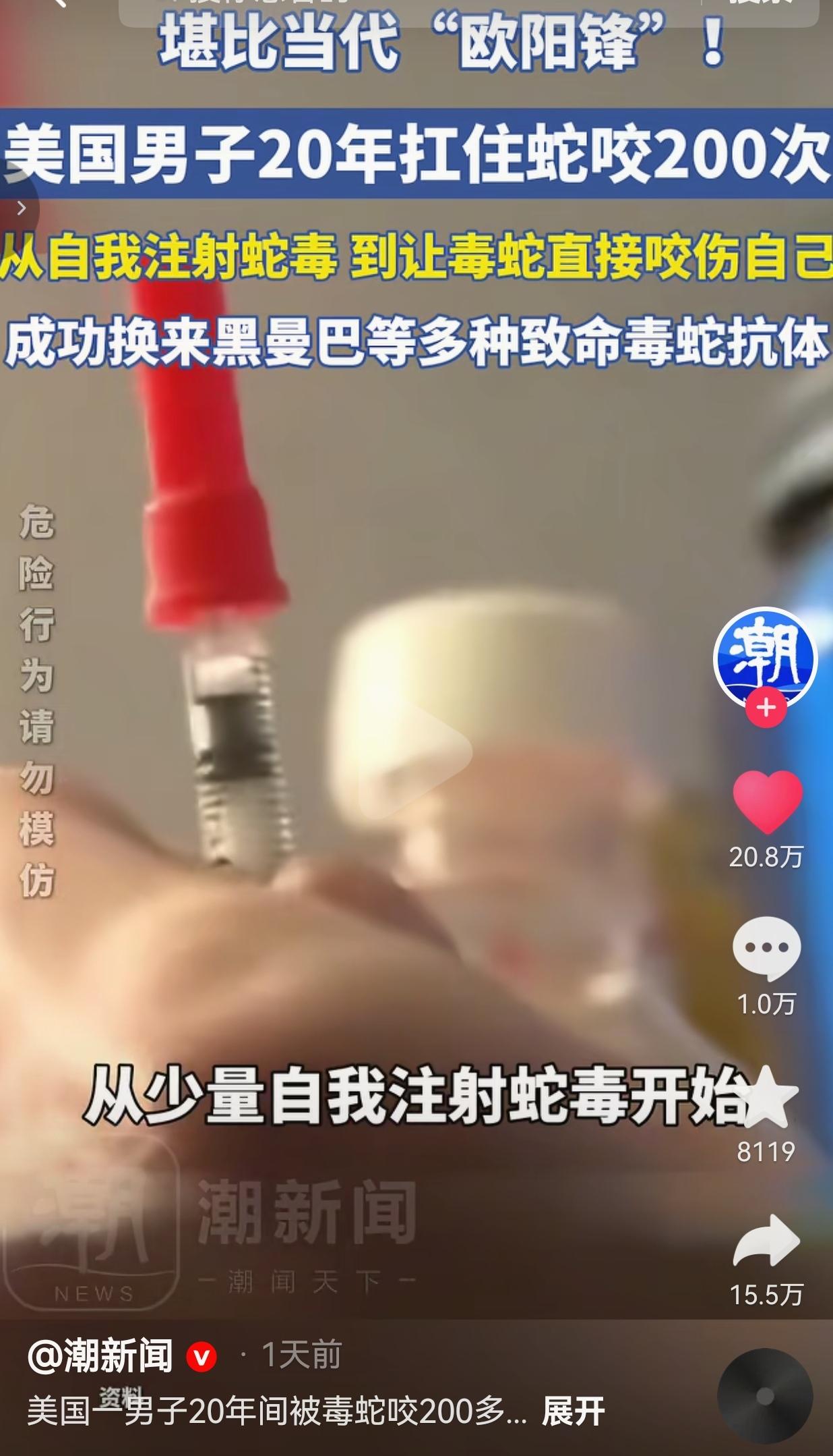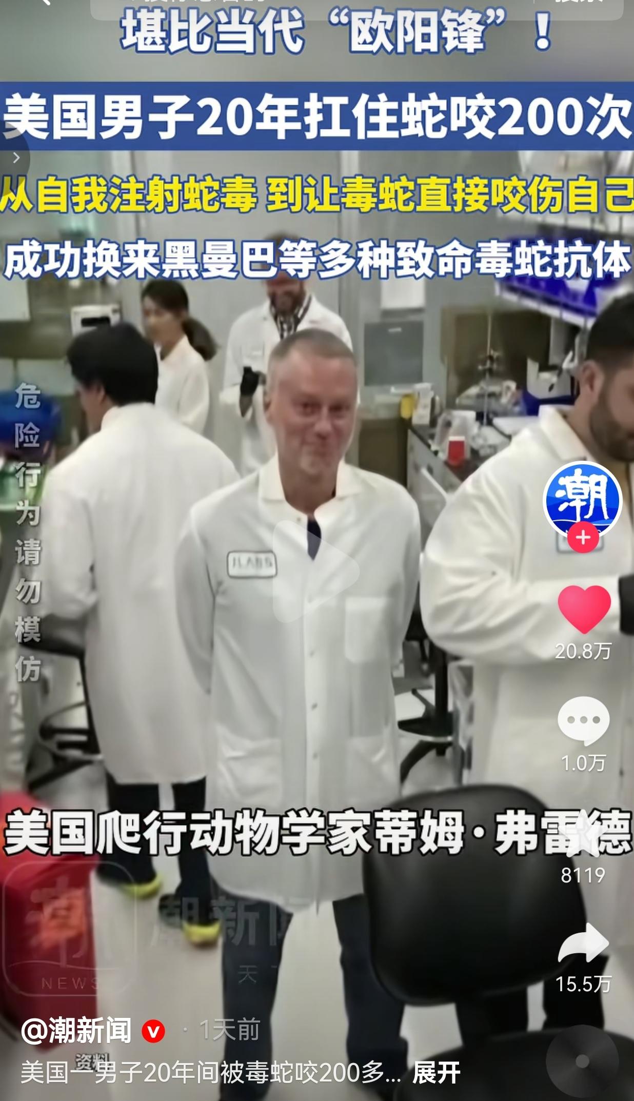 当代“欧阳锋”?美国猛男20年被蛇咬200次,把自己练成行走的“蛇毒抗体库”! 你敢信吗?有个美国老哥,20年里主动让黑曼巴、眼镜王蛇这种顶级致命毒蛇咬了足足200多次,硬生生把自己练成了百毒不侵的“蛇毒抗体库”,直接改写了抗蛇毒血清的历史! 这个狠人叫蒂姆·弗雷德,是个美国爬行动物学家。说出来你可能不信,他最开始就是出于对毒蛇的好奇,想搞明白蛇毒到底能不能让人产生抗体。 别人见了毒蛇躲都来不及,他倒好,直接把命当赌注,开启了一场长达20年的“以身试毒”地狱级挑战。 最开始,他不敢直接让蛇咬,就从少量自我注射蛇毒开始,一点点加剂量,让身体慢慢适应。 等身体扛住了,他直接玩起了更狠的:抓着黑曼巴、眼镜蛇这些能一口致命的毒蛇,直接往自己胳膊上怼,让毒蛇实打实咬下去! 这20年里,他被咬了超过200次,中间甚至有一次被眼镜蛇咬了之后,直接昏迷了整整4天,差点就没救回来! 换别人早吓得这辈子都不敢碰蛇了,结果这老哥醒过来之后,咬着牙接着练!就这么日复一日、年复一年,他的身体硬生生扛住了黑曼巴、眼镜王蛇等十几种致命蛇毒,体内练出了超强的免疫力,成了行走的“超级抗体”。 更牛的是,科研团队直接从他的血液里,提取出了两种关键抗体,研发出了新型混合抗毒血清,堪称能对抗多种蛇毒的“超级救命药”! 实验数据直接炸了:用这款血清,能让实验小鼠完全免受13种致命蛇毒的伤害,对另外6种蛇毒也能提供部分保护!以后被毒蛇咬伤的人,有了更有效的救命药!这哪是普通人?这简直是当代“欧阳锋”,用命练出了绝世武功,还救了无数人! 网友看到后评论说:“我的妈呀!这是人干的事?我被蚊子咬一口都得挠半天,他让黑曼巴咬?这不是狠人,这是狠人他祖宗!” 也有的网友说:“别人拿命换钱,他拿命换科研!这才是真正的勇士!以后抗蛇毒血清有救了,多少人要感谢他!” 还有的网友说:“光看视频我都吓得腿软!他居然主动让蛇咬?200次?我一次都扛不住!这是用生命在做实验啊!” 更有网友表示:“这才叫真正的以身试险!不是为了出名,是真的为了研究,为了救人!比那些作秀的网红强一万倍!” 说实话,我看完这个新闻,鸡皮疙瘩都起来了! 我真的太震撼了!这世界上真的有人,为了搞清楚一个问题,为了研发救命的药,敢把自己的命放在刀尖上跳舞! 有人可能会说:“他是不是疯了?好好的日子不过,非要找毒蛇咬自己?”但你想想,每年全球有多少人被毒蛇咬伤,因为没有有效的抗毒血清失去生命?蒂姆·弗雷德做的这件事,不是作秀,不是博眼球,是用自己的身体,为全人类闯了一条生路! 他不是不怕死,他是明明知道每一次被咬都可能丧命,却还是一次次选择了坚持。20年,200多次致命咬伤,中间还死过一次(昏迷4天),换谁能扛住?这不是简单的勇敢,这是刻在骨子里的执着和奉献! 我们总说“英雄”,总觉得英雄是拯救世界的超人,但真正的英雄,往往就是这样,在没人注意的地方,用自己的命,为别人挡下死神的镰刀。蒂姆·弗雷德就是这样的英雄,他用20年的痛苦和坚持,给无数被毒蛇咬伤的人,带来了生的希望。 真正的勇敢,不是无所畏惧,而是明知山有虎,偏向虎山行;真正的伟大,不是站在聚光灯下,而是用自己的血肉,为后人铺就生路。 蒂姆·弗雷德,这个被毒蛇咬了200次的男人,值得我们所有人致敬!