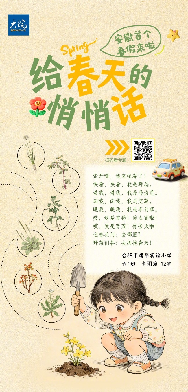 【#孩子们用诗句品尝春天味道#】#给春天的悄悄话# 安徽首个春假遇上清明节假期,大皖新闻“给春天的悄悄话”征集活动收到了大量作品,不少孩子用味蕾感受这个春天——野菜、蒿子粑粑、家乡的风味……他们用诗句“尝”出了春天的另一种模样。