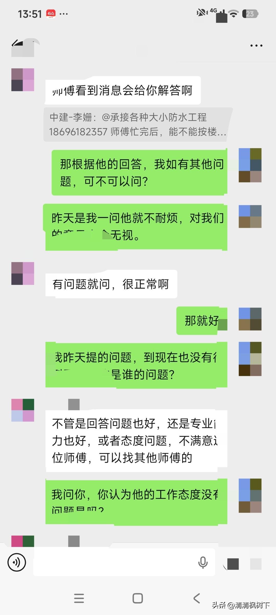 我:“首先,虽然楼下渗水,找楼上我们理解所以也一直配合。但是问题在哪里,只是推断是防水层,一直没有明确定下来。我以为他昨天到家里去至少仔细观察一下我家里的水龙头水管可见部分,也许开开水龙头看看楼下渗水变化状况,结果啥也没做。这是如何排查的?关水闸,开水管检查也要600块人民币吗? 之后我提问他就说我不想解决问题。师傅说橱柜下面是湿的,我马上联系租客去确认,大晚上的确认拍照。弄完发到群里师傅不置可否,又说地砖地下是是湿的。