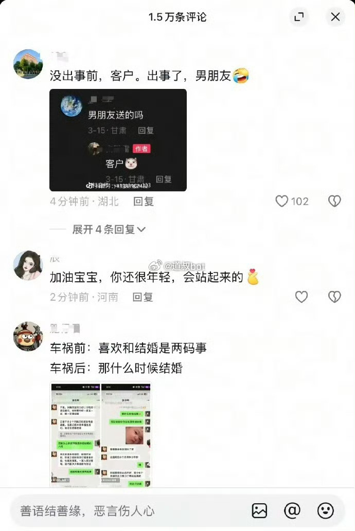 起因,男友驾车致25岁女生截瘫,女生称男友照顾两个月后全家失联,一开始承诺结婚后不想承担无底洞医疗费反悔。但在2个月后失联。因机动车交通事故责任纠纷,白女士起诉了前男友,相关案件于4月7日开庭审理。“我起诉他的原因很简单,我已经付出了代价,不可能说驾驶员不去承担这个责任,因为主责都是他。”