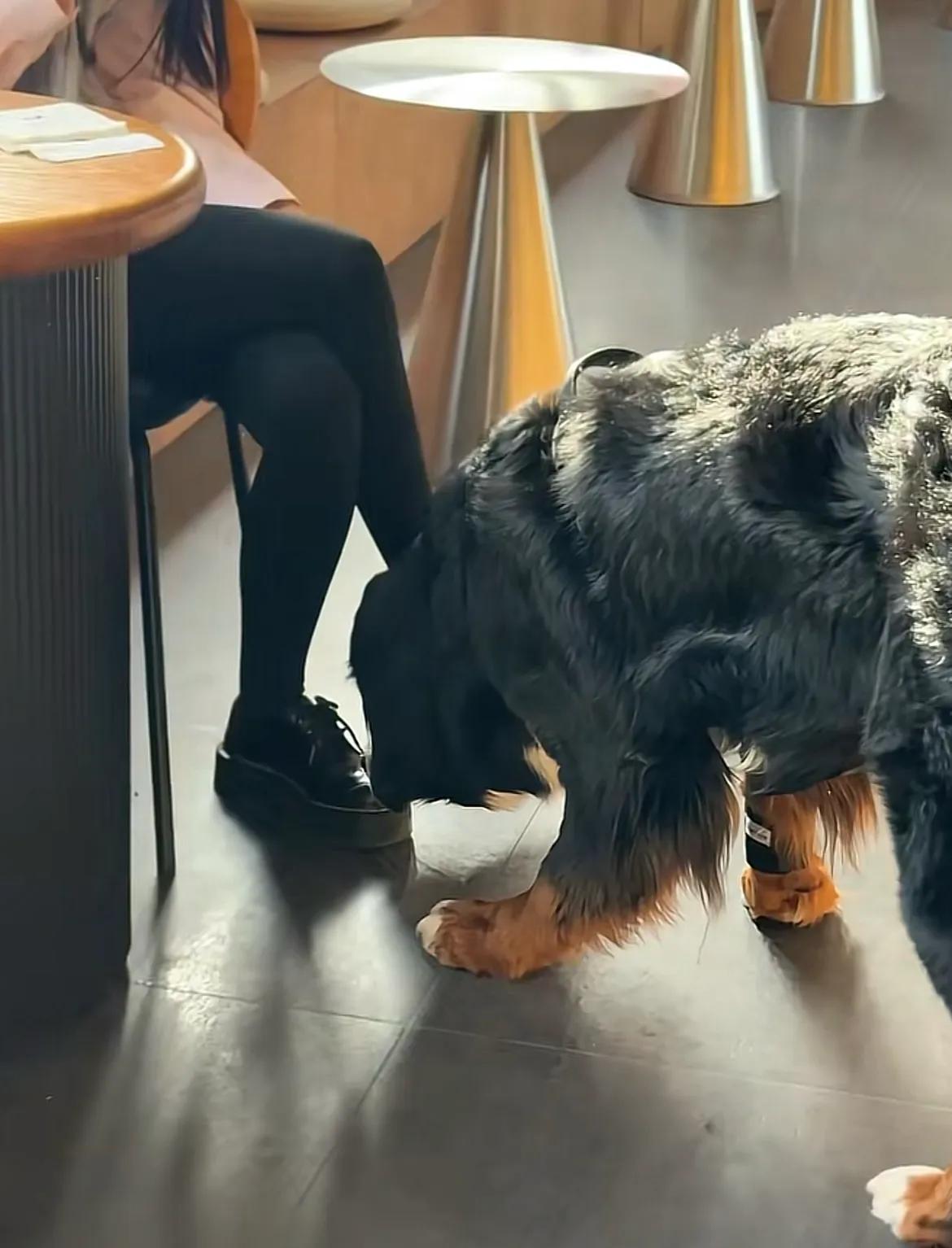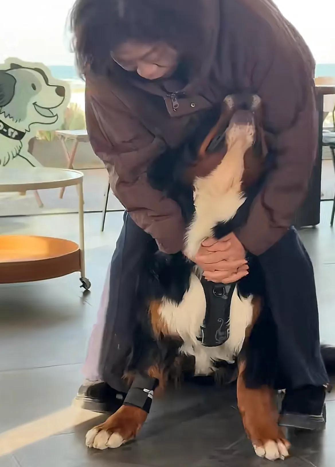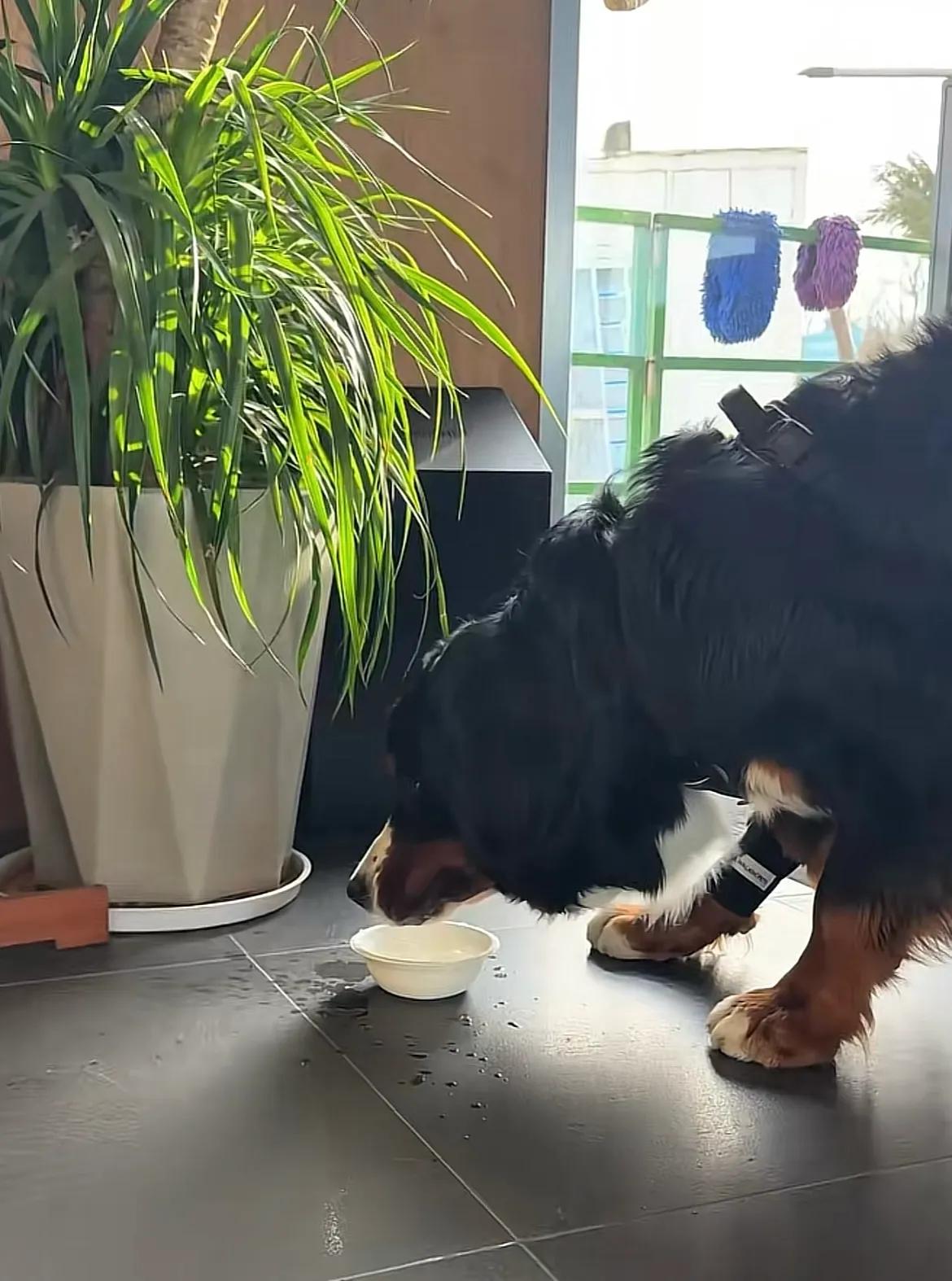 山东烟台,网友发现身价五万的伯恩山犬啾啾有班味儿了,上班时不是趴着就是喝水摸鱼,可是当主人来接它下班时,高兴到飞起。