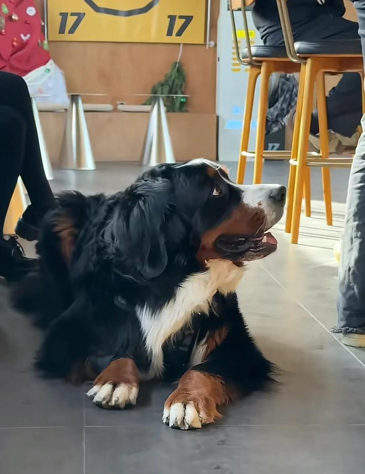 山东烟台,网友发现身价五万的伯恩山犬啾啾有班味儿了,上班时不是趴着就是喝水摸鱼,