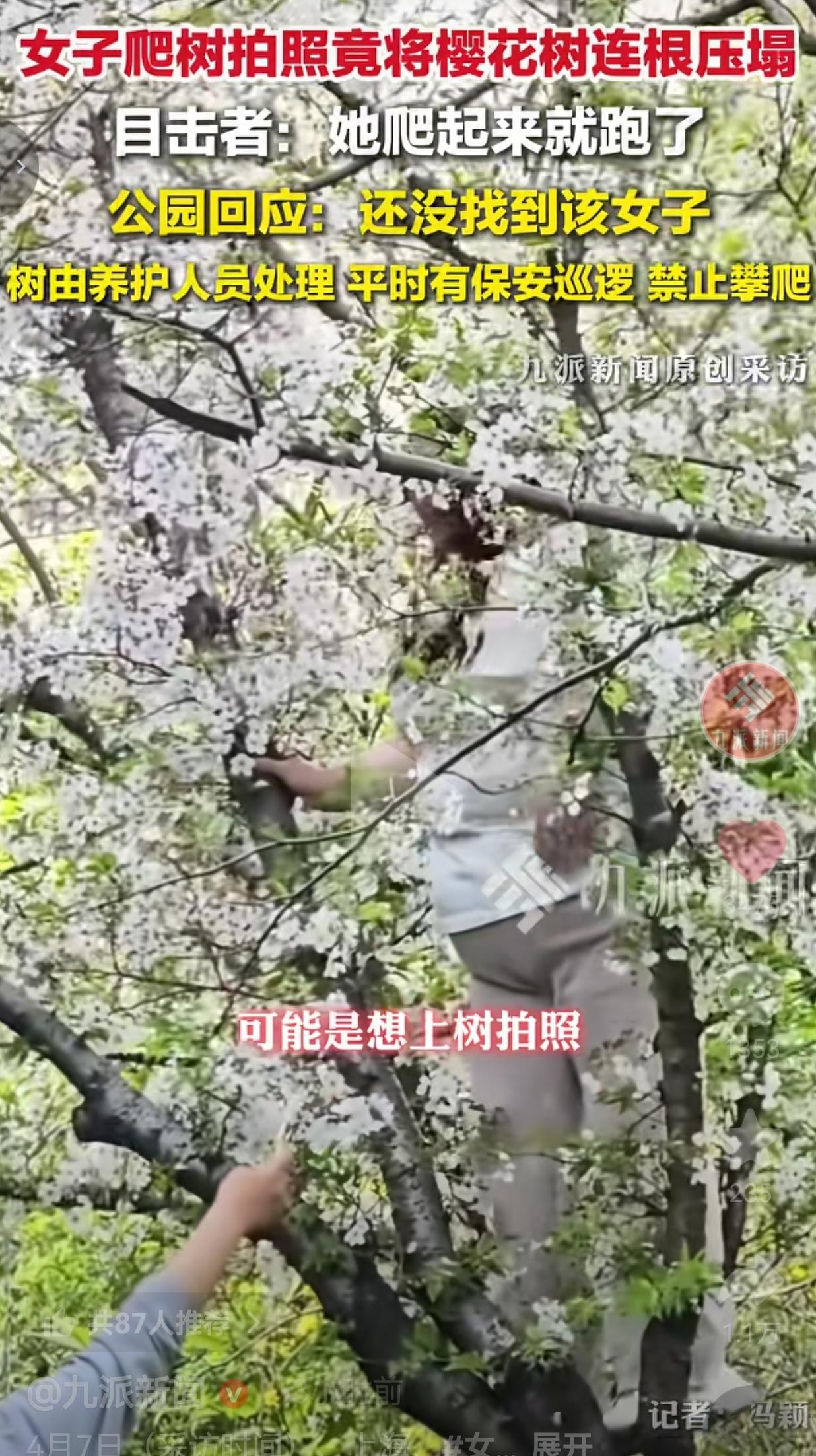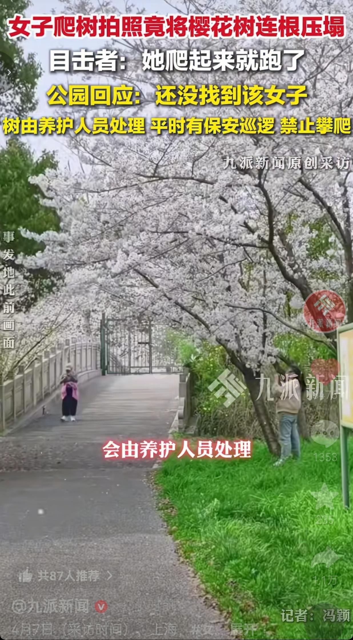 太令人生气了!一女子为了拍张网红照,把20多年的樱花树连根压塌,树倒了拍拍屁股就跑,连句道歉都没有!这种没素质的操作,真把全网看炸了! 4月6日,上海顾村公园外环林带,一名女子为了拍出“人在花中”的效果,直接爬上一棵开得正盛的樱花树。 视频里清清楚楚:她整个人挂在树枝上,抱着树干使劲晃,旁边“禁止攀爬”的牌子视而不见,完全不管树能不能扛住她。 只听“咔嚓”一声巨响——整棵树直接连根塌了!树枝断裂、花瓣碎一地,场面惨不忍睹 ! 更气人的是:树倒后,她爬起来就跑,一溜烟没影了!没愧疚、没查看、没道歉,留下一棵被拔起的樱花树和满地狼藉,目击者想拦都拦不住 ! 4月7日园方回应:这是棵20多年的老樱花树,当天已扶正,但能不能活还难说;目前还没找到人,只能加强巡逻劝阻 。 网友看到后评论说:“顾村樱花是给大家看的!为了拍戏张照片弄死一棵树,跑了就完事?还有没有素质?” 也有的网友说:“好好的树,多少人盼着看,被她一个人毁了!跑得了和尚跑不了庙,必须赔!” 还有的网友说:“自己几斤几两没数?爬树时不想想会塌?毁公共财物还跑路,太自私!” 更有网友表示:“直播界有辛巴退网,赏花界有爬树逃跑!为了流量/照片,底线都不要了!” 说实话,我真看怒了! 每年春天,多少人千里迢迢来顾村,就为看一眼樱花、感受春天。结果就因为一个人的自私,20多年的老树毁了、整条街的风景没了、无数人的好心情糟蹋了! 她不是不小心,是明知故犯:有禁止牌、有保安巡逻,她偏爬;树在晃、枝在裂,她偏摇;为了一张朋友圈照片,完全不管公共利益、不管别人感受 。 更无语的是:树倒第一反应不是负责,是逃跑!心里明知道错了,就是不想担责,把烂摊子丢给公园、丢给养护工人。 别拿“爱美、拍照”当借口!爱美不等于没素质,拍照不等于毁公物。站着拍、蹲着拍、志愿者免费帮拍,怎么都好看——非要爬树、非要压塌、非要逃跑? 说白了就是极度自私:只想着自己出风头,完全不管别人、不管公共财物、不管社会公德。这种人,照片再美,也遮不住骨子里的没教养! 樱花年年开,但不是每棵树都经得起糟蹋。 公共风景是大家的,不是你一个人的拍照道具。享受美景的同时,更要守规矩、护公物、讲良心。 树倒了可以再种,但一个人的素质塌了,很难再捡起来。希望能找到这名女子,该赔就赔、该道歉就道歉,给所有人一个交代。 也给所有人提个醒:真正的体面,从来不是爬树拍出来的,是刻在骨子里的守规矩、懂尊重、有底线! 最后,我想说的是:风景再美,美不过底线;照片再靓,靓不过教养! 对此,你有什么看法呢?