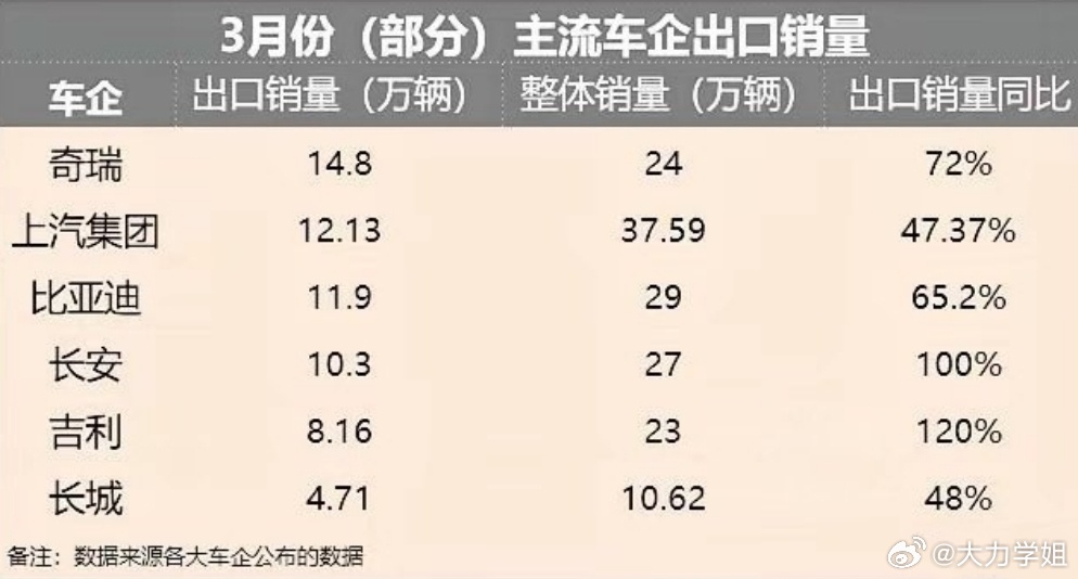 整体数据也很给力:比亚迪依旧领跑,海外新能源近6万辆;吉利出口5.2万辆,奇瑞、上汽紧随其后;长城、长安、广汽稳步增长。