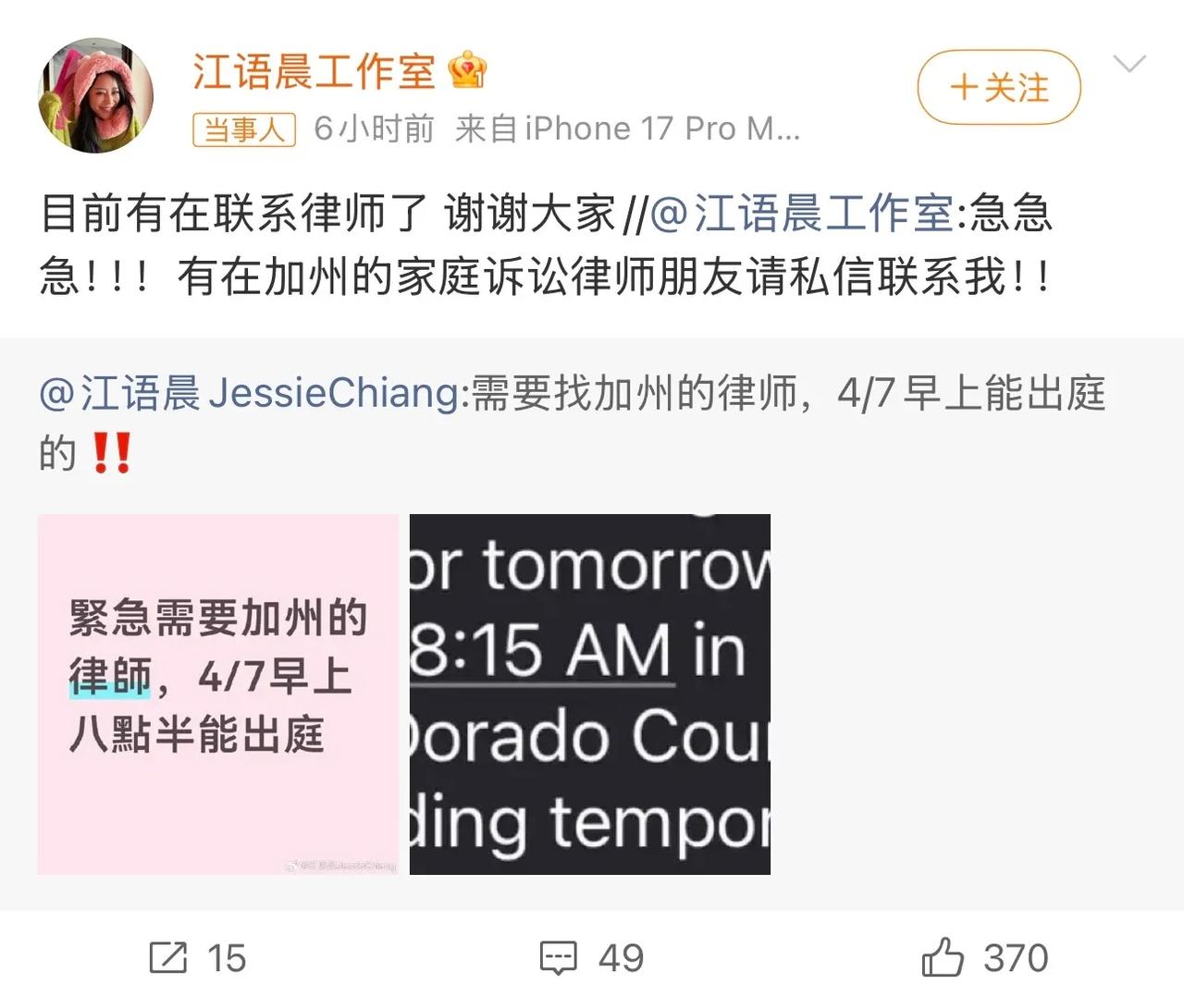 孩子他爹好像突然争抚养权了,然后江语晨在网上寻4月7日在美国的律师。