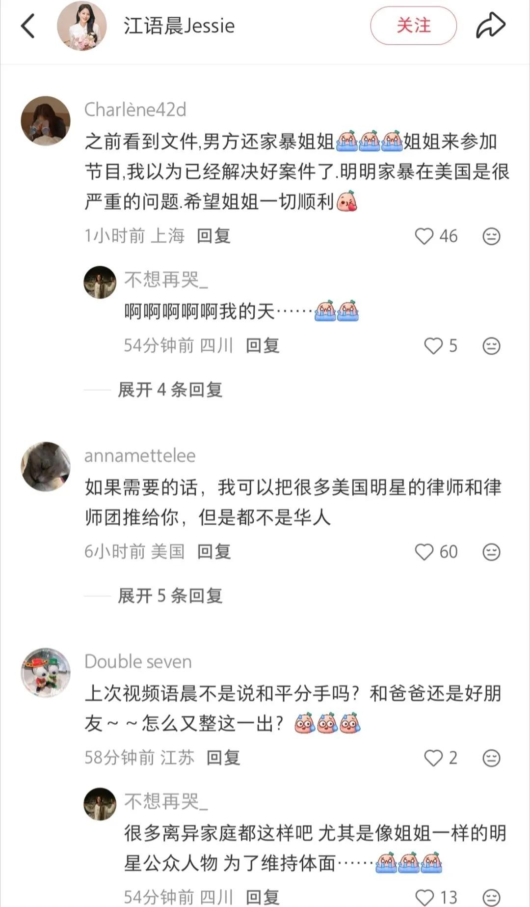 去年,江语晨曾在社交平台发布视频,宣布离婚。视频中,江语晨曾说离婚是与前夫商量后共同作出的决定,离婚后和前夫还是朋友,会一起带着孩子们玩。江语晨还透露,孩子们曾说,只要妈妈开心就好,支持妈妈的决定。