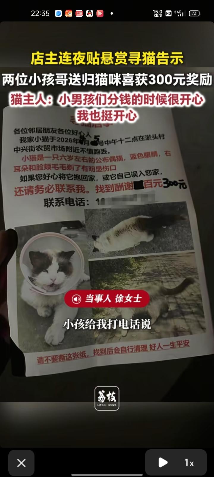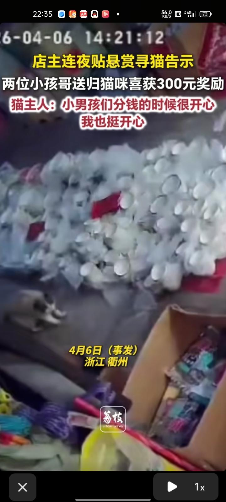 4月6日,衢州江山市。店主徐女士成,自家猫丢失了,连夜贴悬赏寻猫告示,结果有位小孩哥打电话说自家猫和别的猫在哈气,提前准备好300块零钱,到店里把猫咪归还。看到小男孩分钱时很开心,自己也感到开心