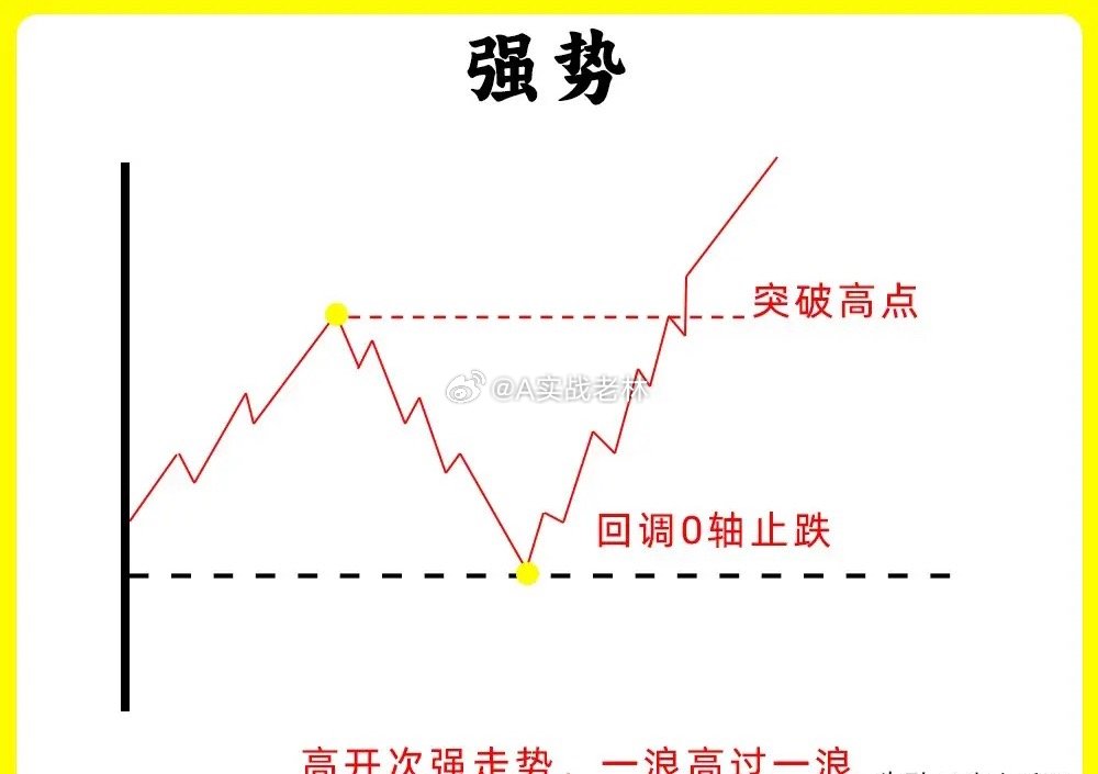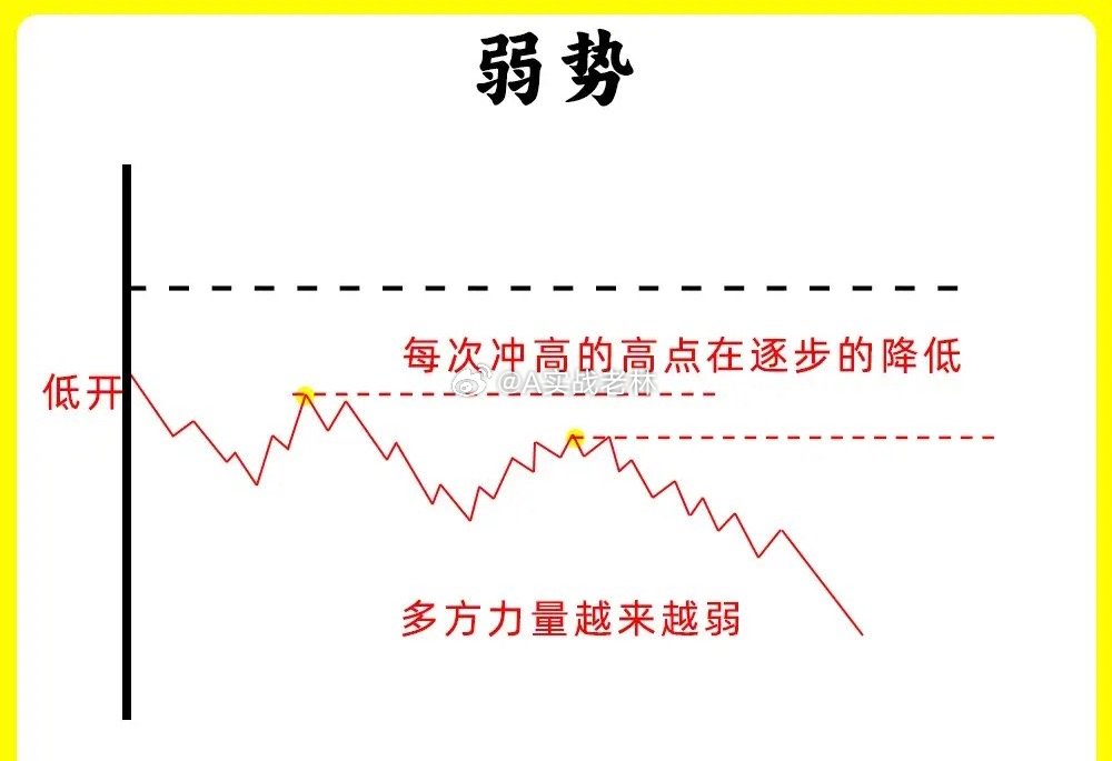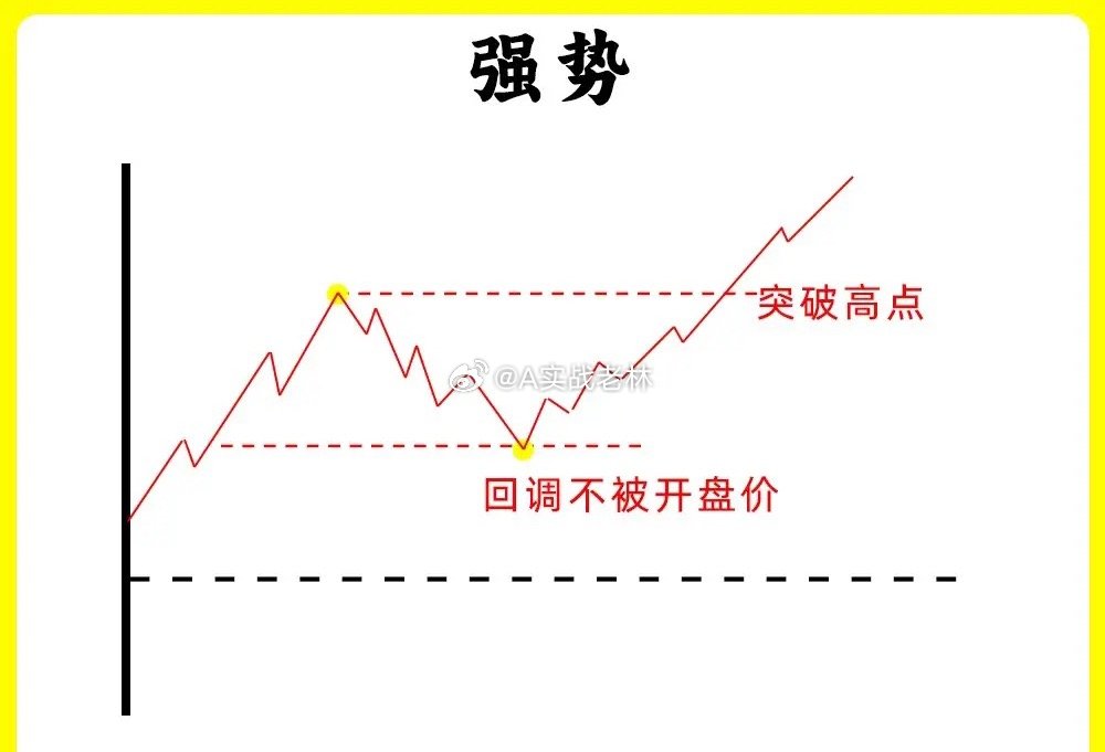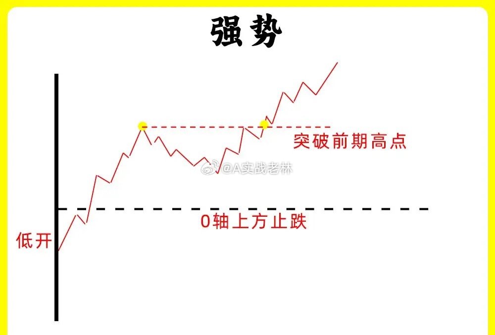 注意了!做短线都应该找强势股,那困扰散户的大问题就来就来了,在分时图里,什么样的才是强势?什么样的才算是弱势。如果你也有这样的疑问,那这期内容一定要认真看完,让你对分时图的认知能向上一个台阶还是老规矩,点赞收藏或评论888支持一下,老林每天分享炒股干货,以免想温习找不到了,我总结了六种形态,我们一个个来看看第一种股价高开以后,开始上涨形成一个高点,随后股价开始回调,回调不破开盘价,开始止跌企稳,随后反弹向上,突破早盘的高点,强势第二种股价高开以后,开始上涨,出现前期高点,随后开始回调,但是回调不破昨日收盘价,也就是0轴上方,开始止跌向上,突破高点,创当天新高,强势第三种股价早盘低开,随后继续下跌,反抽形成一个高点,高点低于开盘价,继续下跌,整个过程里,股价高点都在降低,这是明显下降通道,弱势第四种股价早盘低开,随后冲高,但是都没有翻红,形成一个高点以后开始回调,整个过程里,股价就在整个高点和回调低点,来回震荡,弱势第五种股价低开以后,开始冲高,触碰0轴,随后调整以后,继续冲高,整个过程,股价高点都不断抬高,低点也抬高,,形成上升通道,强势第六种这种形态和第二种很相似,股价早盘低开以后,开始冲高,在0轴上方运行,形成形成一个高点,随后股价开始回调,在0轴附近开始止跌,反弹向上,突破早盘高点,创下新高,强势这就是分时图中的六种形态,我在下方整理六组案例图,建议文章和案例结合看。如果还有什么问题,可以留言告诉我。希望对大家有启发