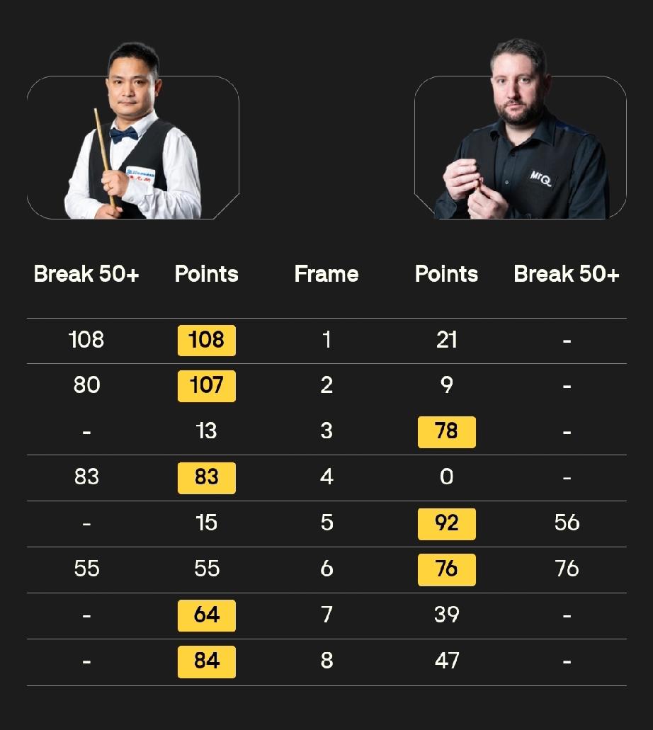 傅家俊 5-1 旺哈鲁泰 许医尘 5-3 斯图尔特·卡林顿 4月7日17:00,斯诺克世锦赛资格赛144进112轮次,两名中国球员登场,19局10胜赛制。