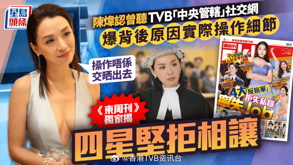 最新一期《东周刊》独家爆料,TVB为严控旗下艺人社交平台风险推出“辣招”,强制艺人将IG、FB、小红书等社交平台账号密码上交公司进行“中央管辖”。但有艺人拒绝妥协而遭雪藏,郭柏妍、游嘉欣随即被踢出节目《魔音女团》,张振朗和戴祖仪宁愿失去工作也坚持“抗旨”。